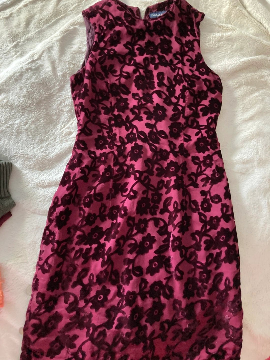 A beautiful floral dress. Sleeveless, with a zipper down the back. Perfect for a special occasion. Silk and rayon blend. Made in Canada! Colour dark red wine.