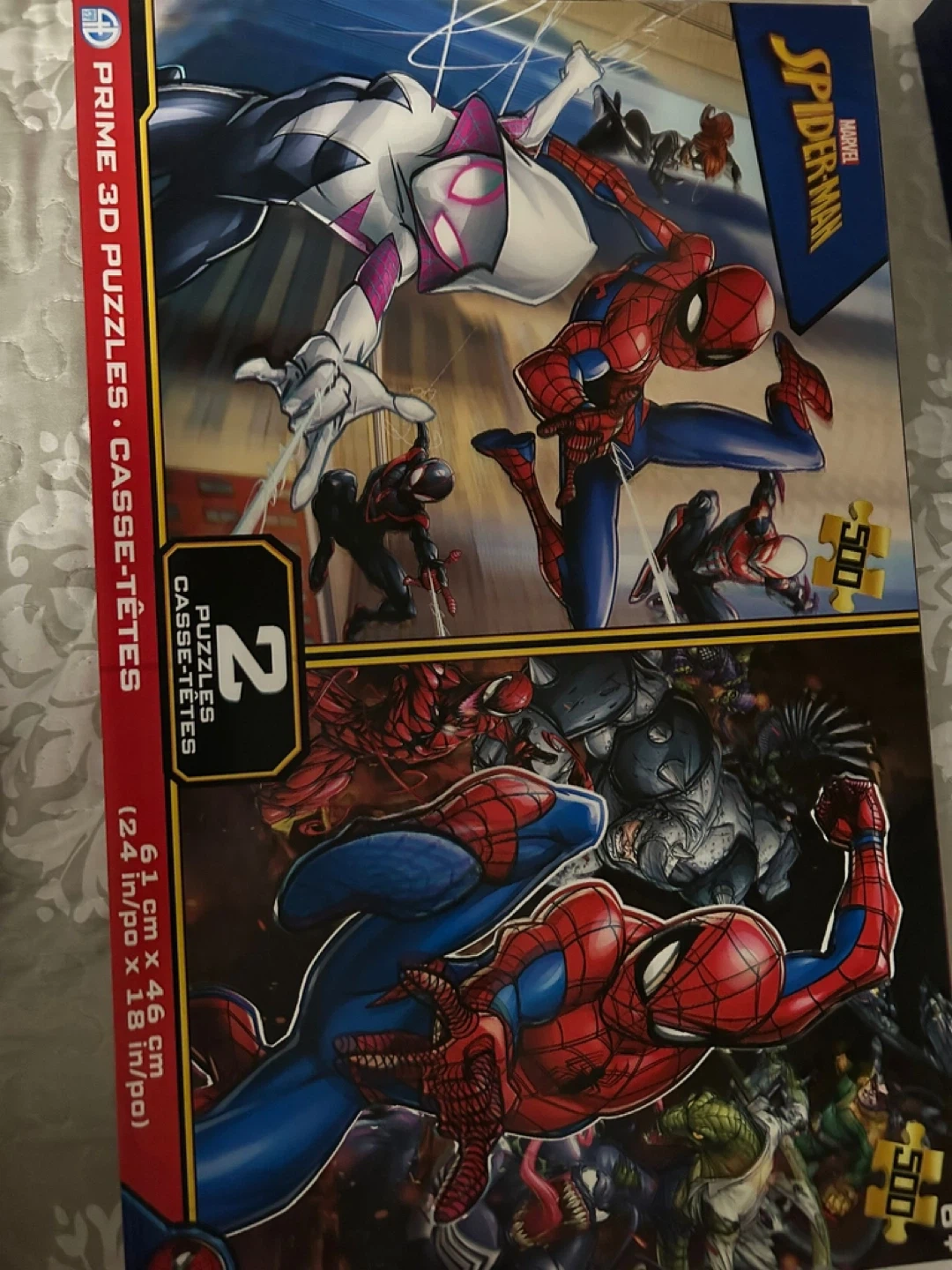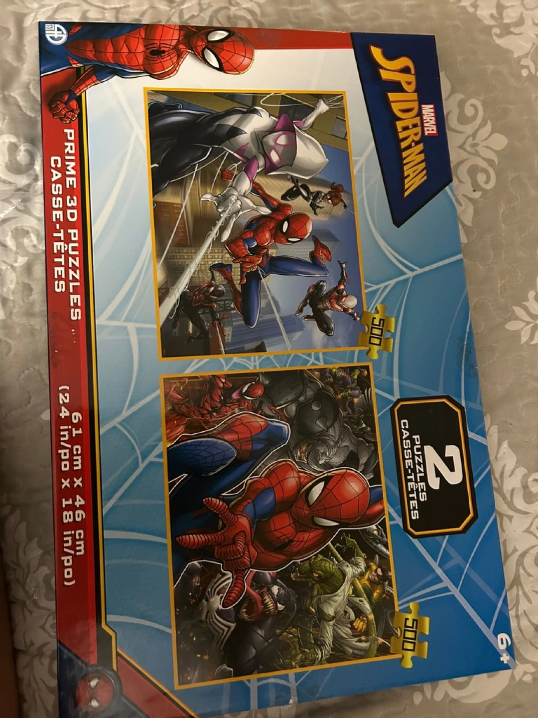 Selling a Marvel Spider-Man Prime 3D puzzle set! This set includes two puzzles, each with 500 pieces. Box dimensions are 61 cm x 46 cm (24 in x 18 in). Suitable for ages 6+