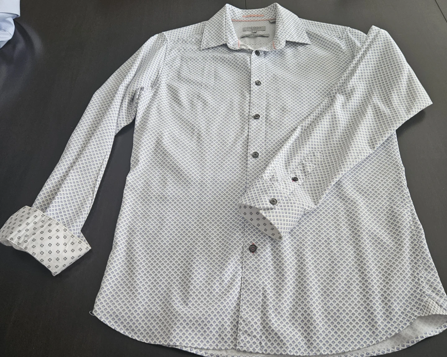 This is a Ted Baker long-sleeved dress shirt with a white and blue geometric pattern. It's made with stretch fabric for comfort. Size is 3. It was lightly used. Looks brand new.