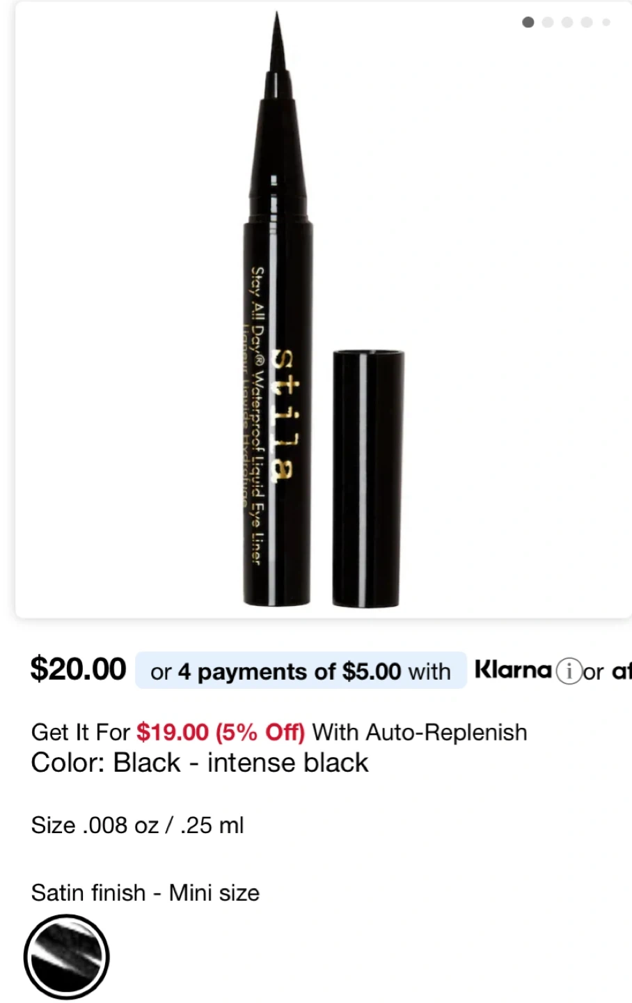 Selling a Stila Stay All Day Waterproof Liquid Eyeliner in black. It's a mini size with a satin finish. The size is .008 oz / .25 ml. Originally retailed for $20+tax