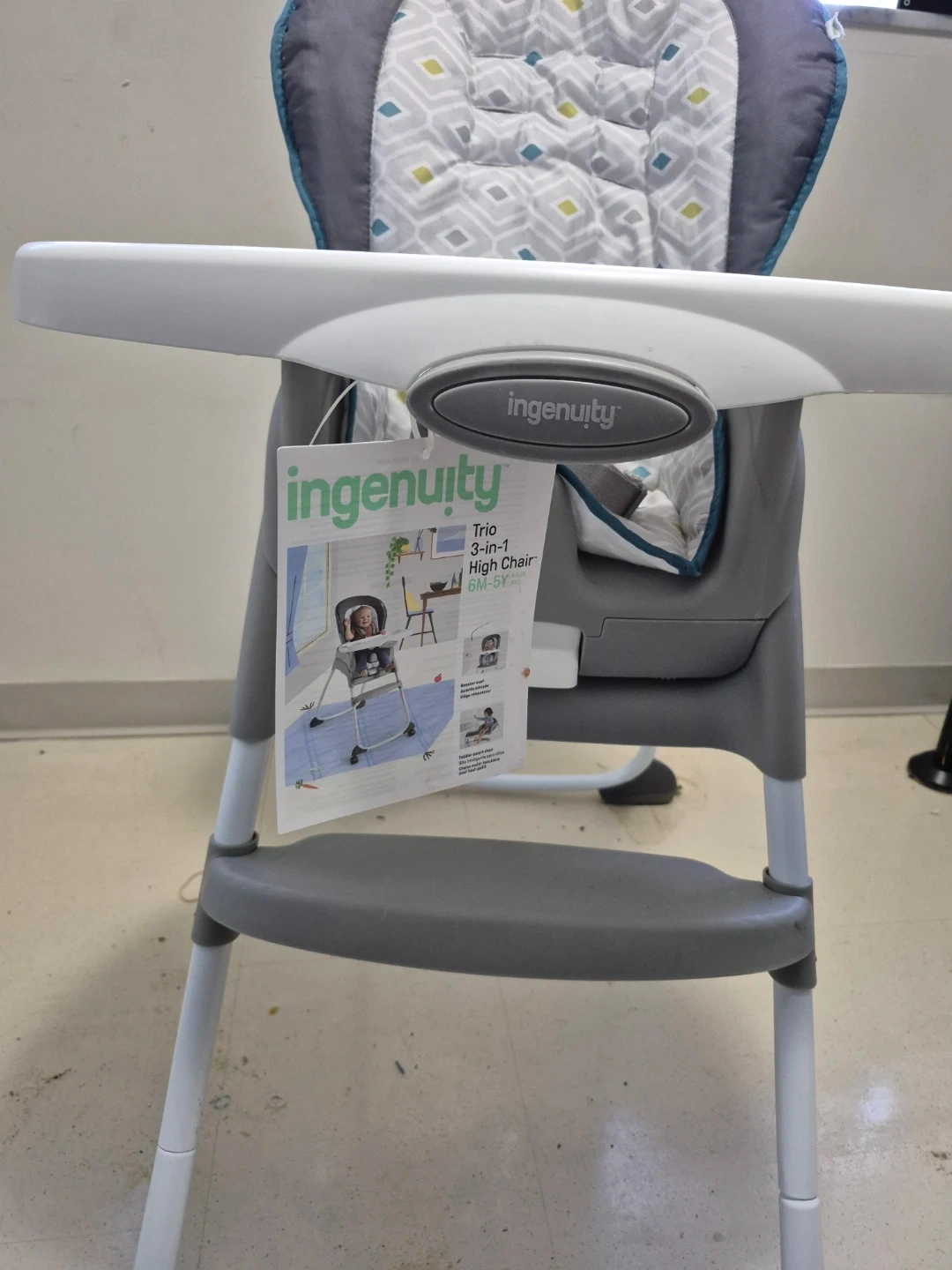 This Ingenuity Trio 3-in-1 High Chair is designed for kids from 6 months to 5 years old. It converts to a booster seat and toddler seat. The seat pad is washable. It has a removable tray with cup holders.