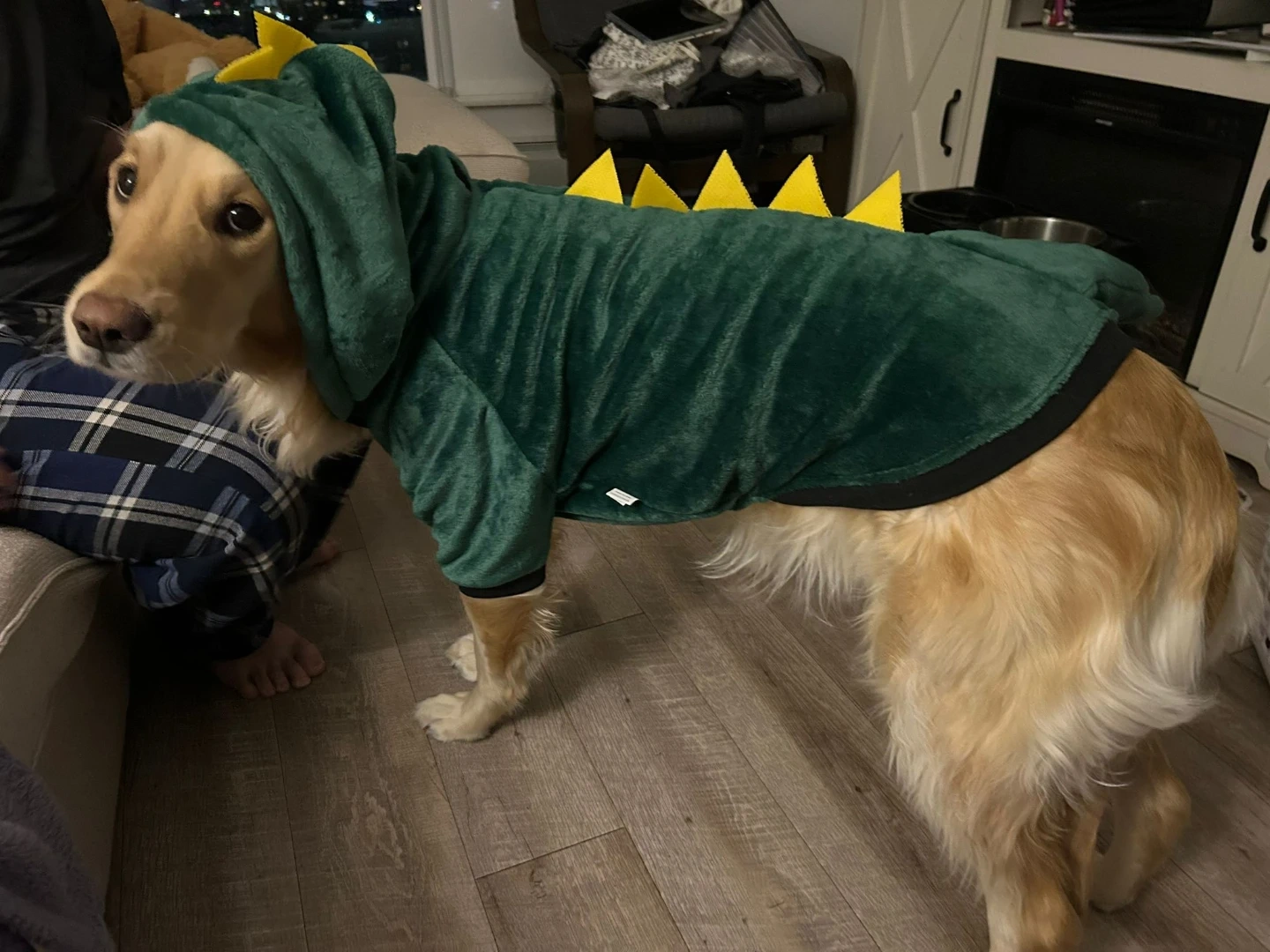 This fun pet costume is designed as a green dinosaur with yellow spikes along the back and tail. It's made of soft, plush material for comfort. The size is 5XL. It's perfect for Halloween or costume parties!