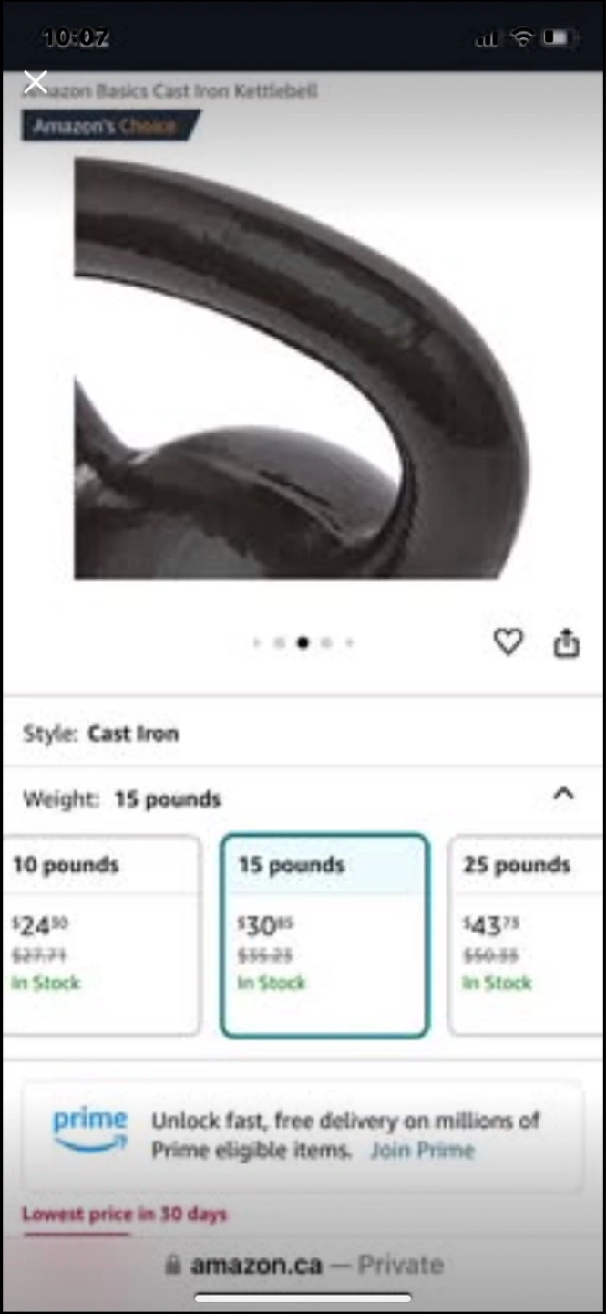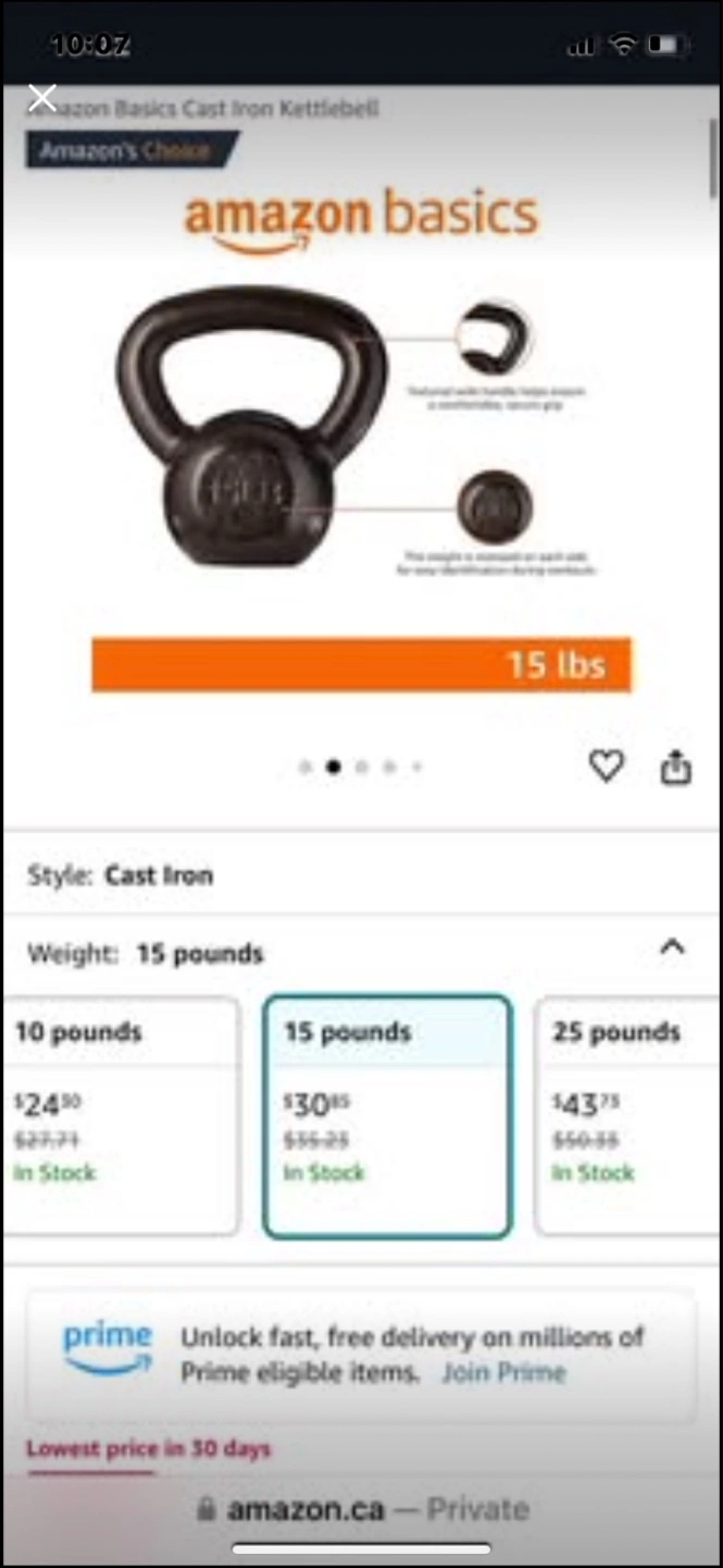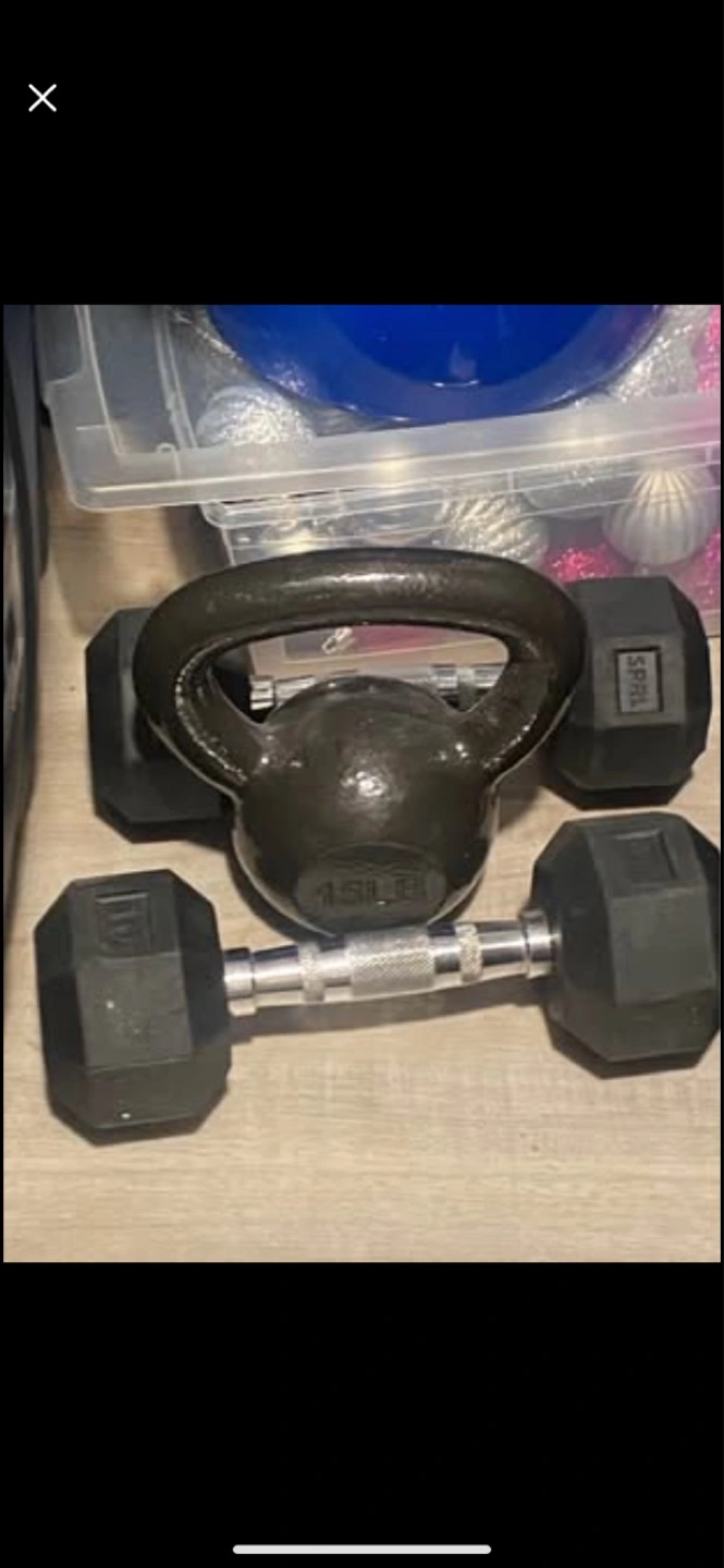 Amazon Basics 15-pound cast iron kettlebell. Includes SPRI 10-pound rubber dumbbells. Great for home workouts. Barely used!