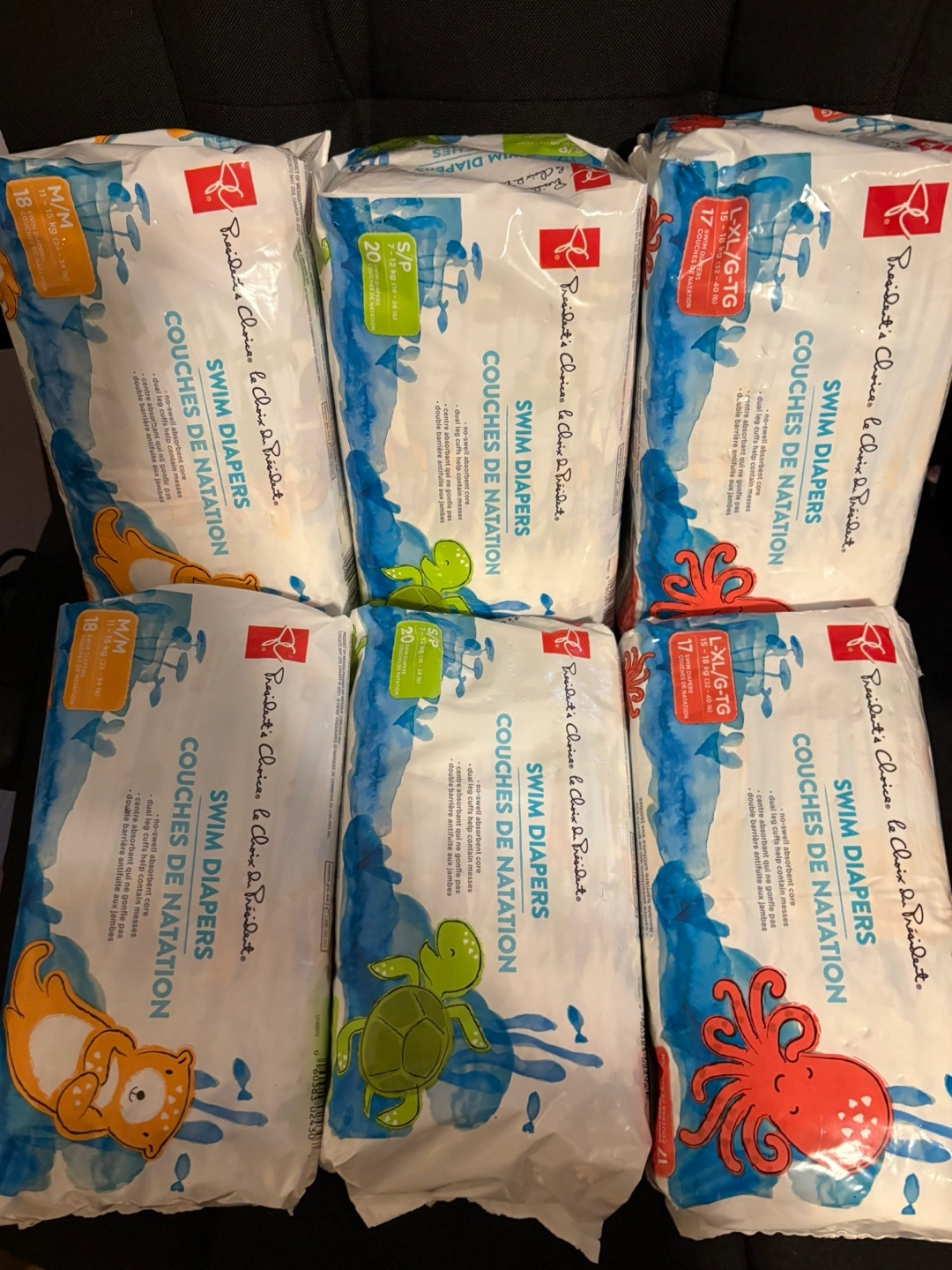 Selling a variety of President's Choice swim diapers in different sizes. You'll find sizes S/P (7-12 kg), M/M (11-15 kg), and L-XL/G-TG (15-18 kg). Great for keeping your little one comfortable at the pool or beach! They feature a no-swell absorbent core and dual leg cuffs to help contain messes