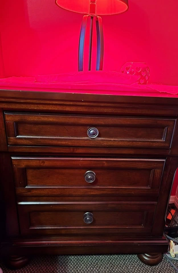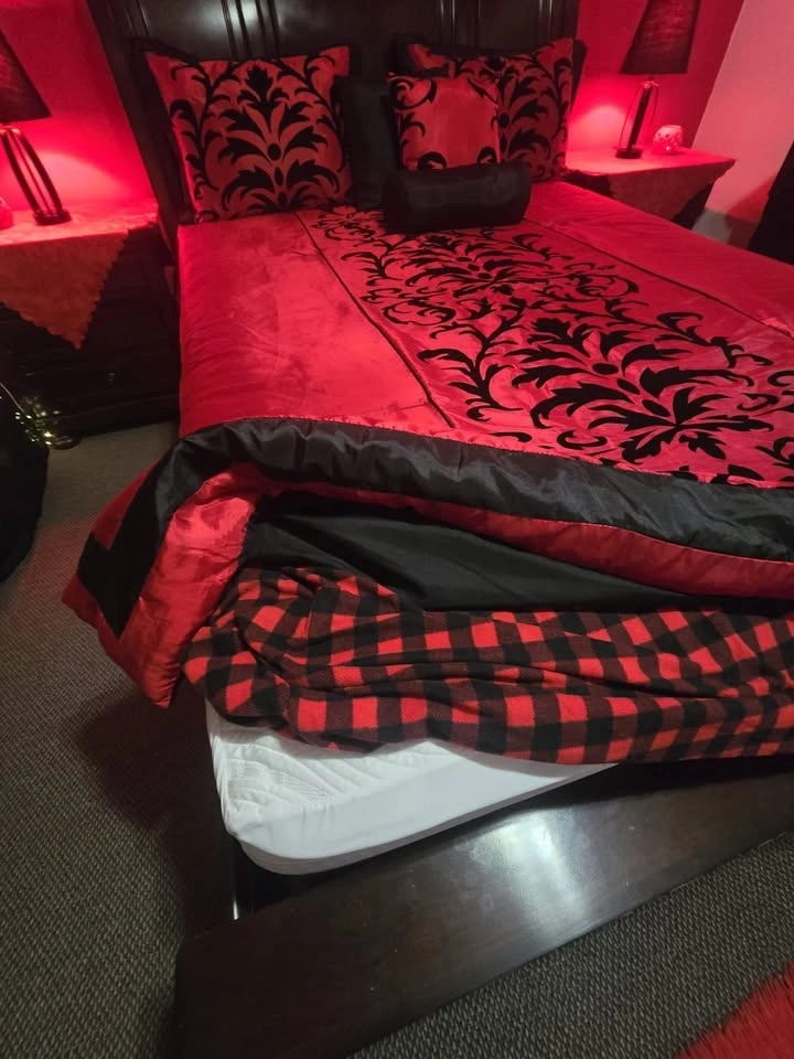 Full bedroom set, everything you see is included. It's real wood with no damages. I'm moving out of the country, which is why I'm selling it. It's been used lightly and includes two nightstands with hidden drawers. There's a large dresser with 7 drawers and a mirror, a queen-sized bed with a new mattress that has two drawers on the bottom. I'm not firm on the price as I need it gone soon. Originally purchased for $3,750 with the mattress. Includes 2 lamps, blankets, and covers. Free red mat. Located at 108 Ave, 144 st.