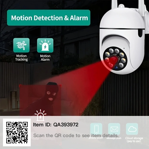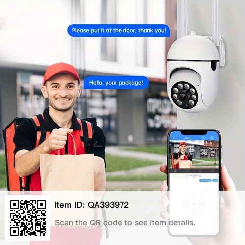 Outdoor/Indoor 360°rotating security camera. Features motion detection, alarm, two-way audio, and phone alerts. Includes night vision and WiFi connectivity. Easy setup. Great for home, garage, business, and more.