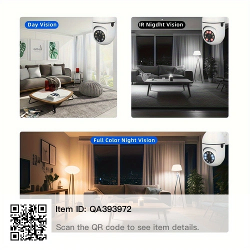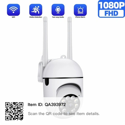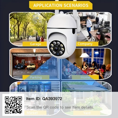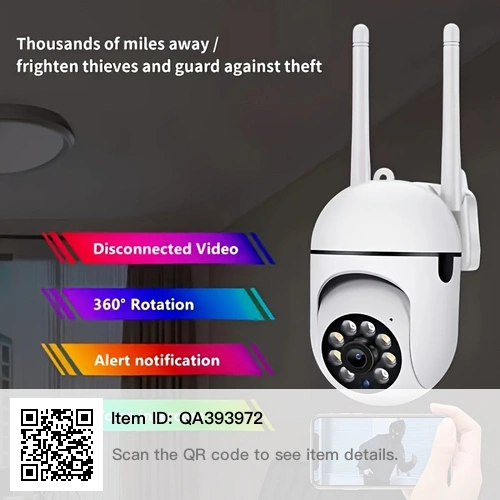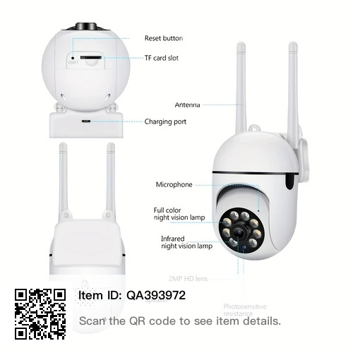 Outdoor/Indoor 360°rotating security camera. Features motion detection, alarm, two-way audio, and phone alerts. Includes night vision and WiFi connectivity. Easy setup. Great for home, garage, business, and more.