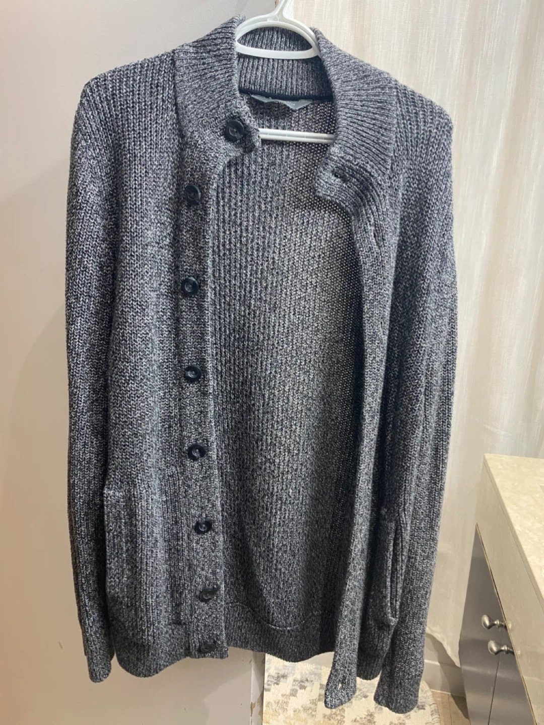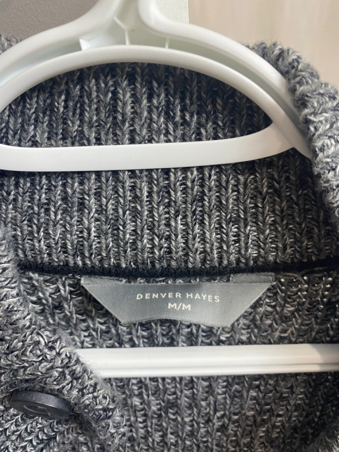 A Denver Hayes button-up cardigan in a marled grey knit. It features a collared neckline and two front pockets. This knit is size M/M. Fits more like a L/XL. Worn no more than 5 times. Discount if bundling items.