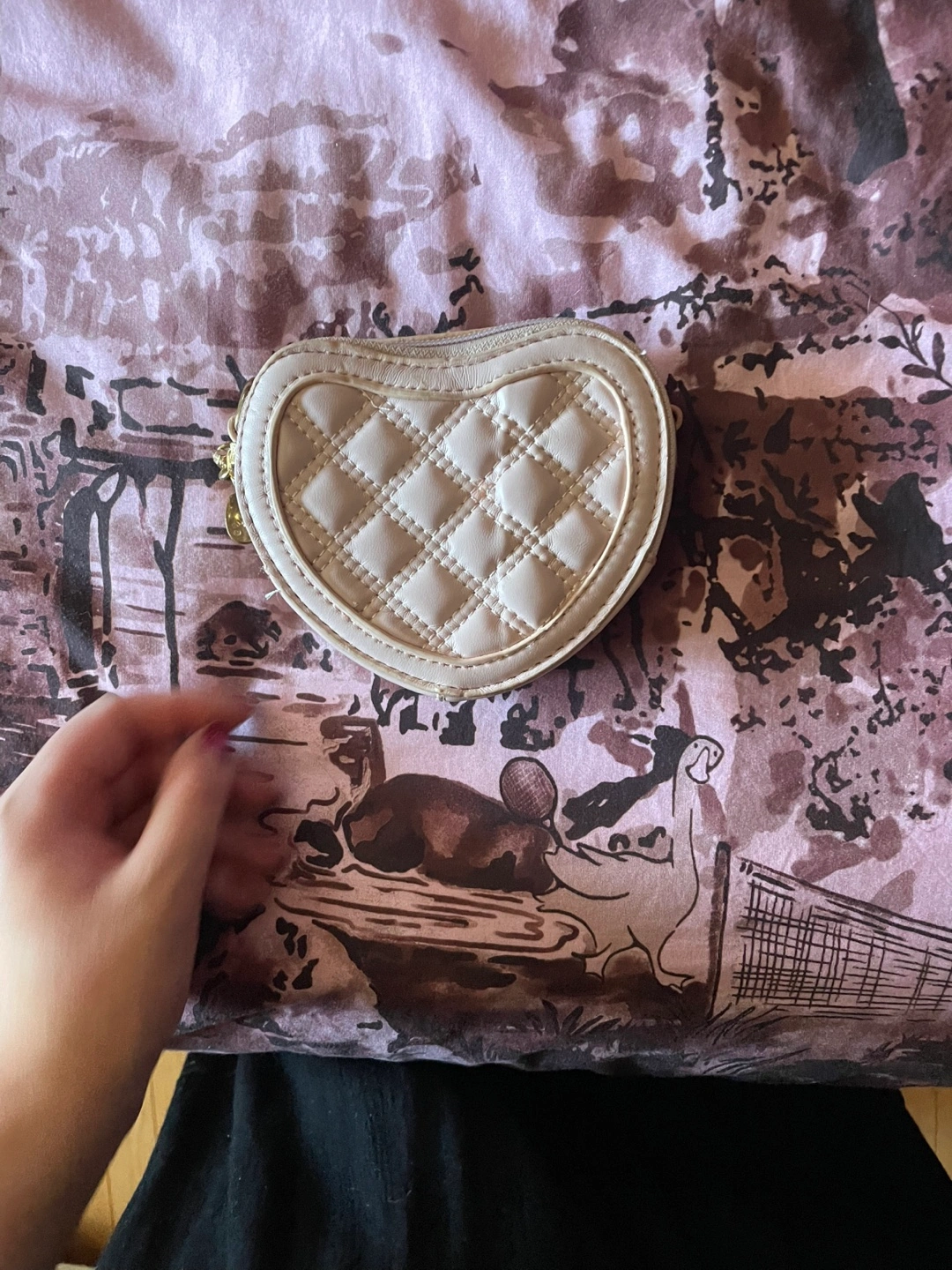 Small quilted heart-shaped bag. Features a zipper closure. Missing strap. Pale pink colour. Perfect for carrying small items.