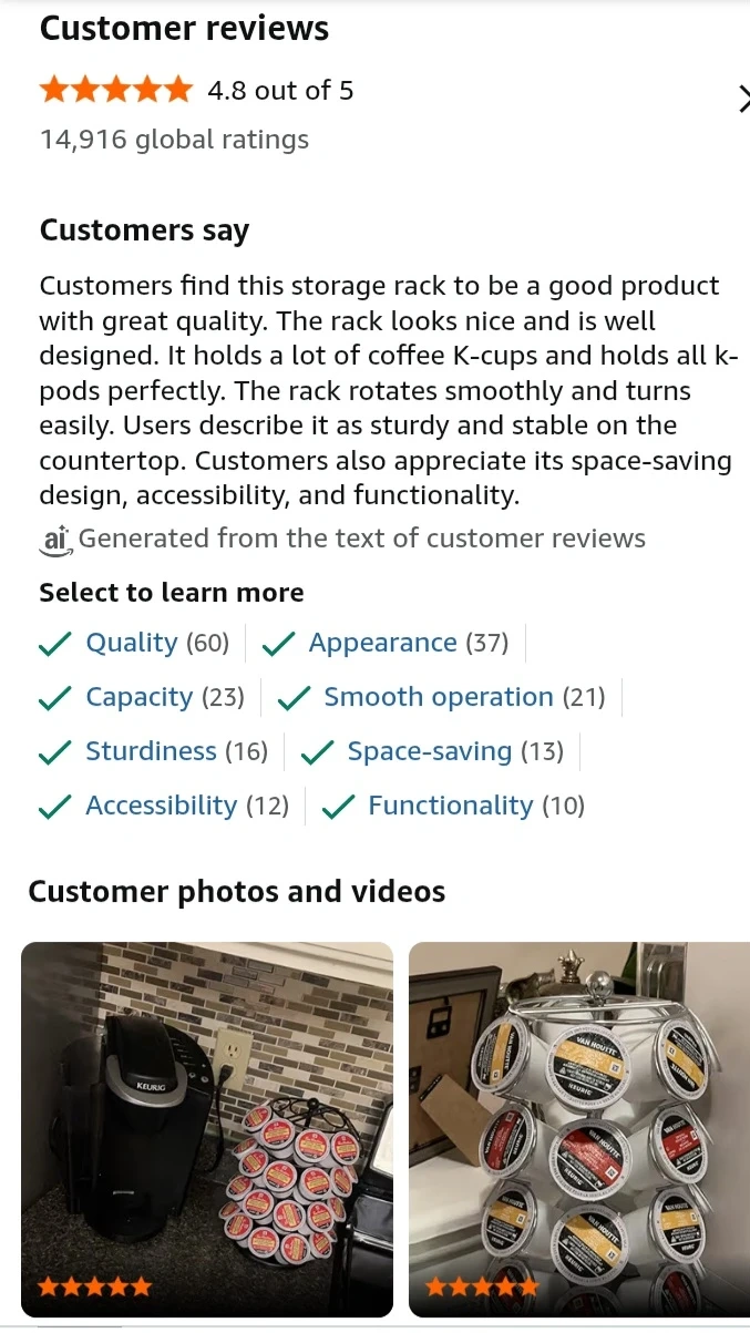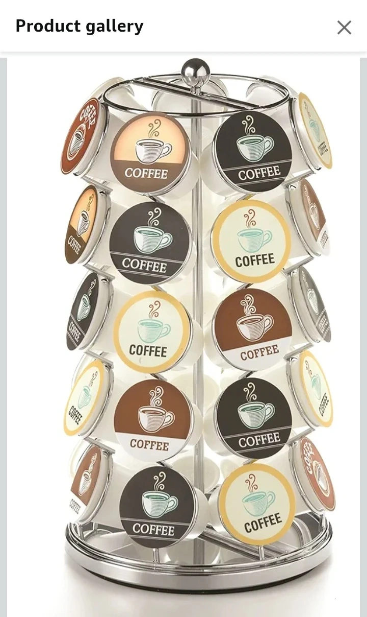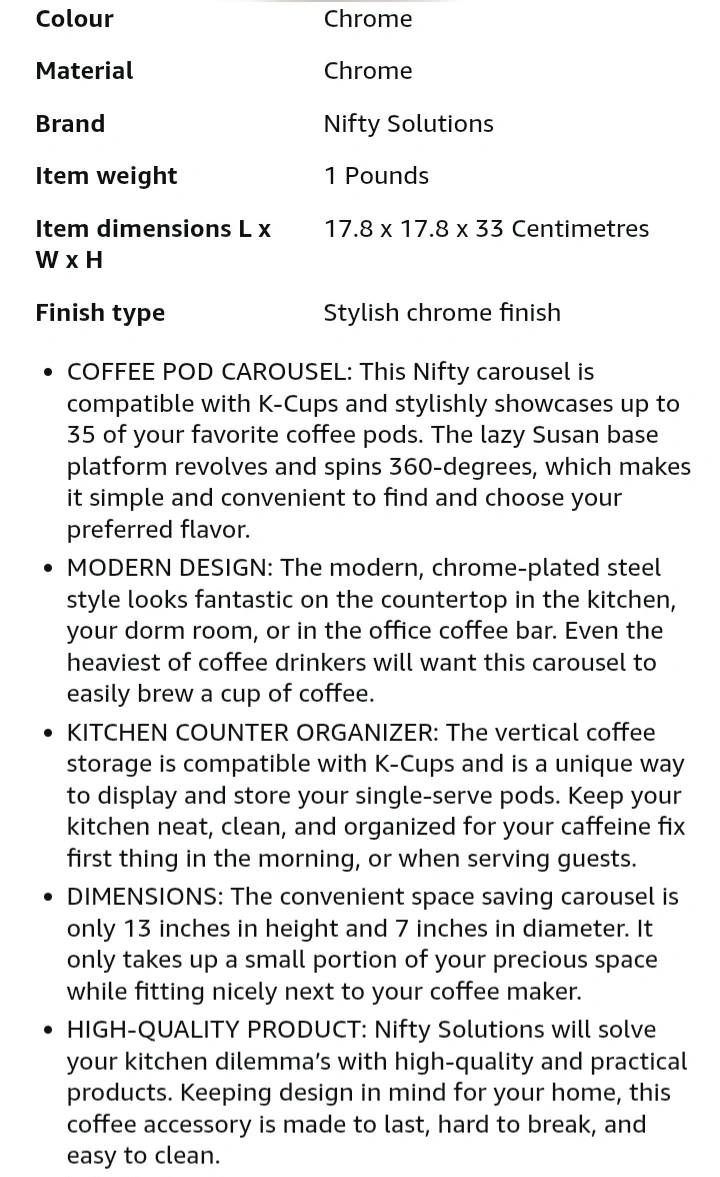 This coffee pod carousel holds 35 K-Cups. It's made of chrome-plated steel and spins 360 degrees. It measures 13 inches high and 7 inches in diameter. Keeps your kitchen neat and organized!