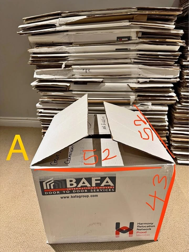 High-quality moving boxes, previously used for international transport. They are strong, clean, and well-maintained.