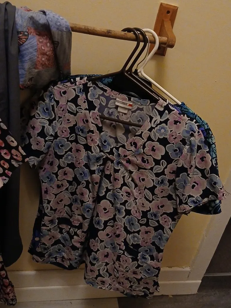 Here's a gently used White Cross scrub top featuring a lovely floral pattern! It's perfect for anyone in the medical field or for casual wear. The material is soft and comfortable, great for long shifts or everyday activities