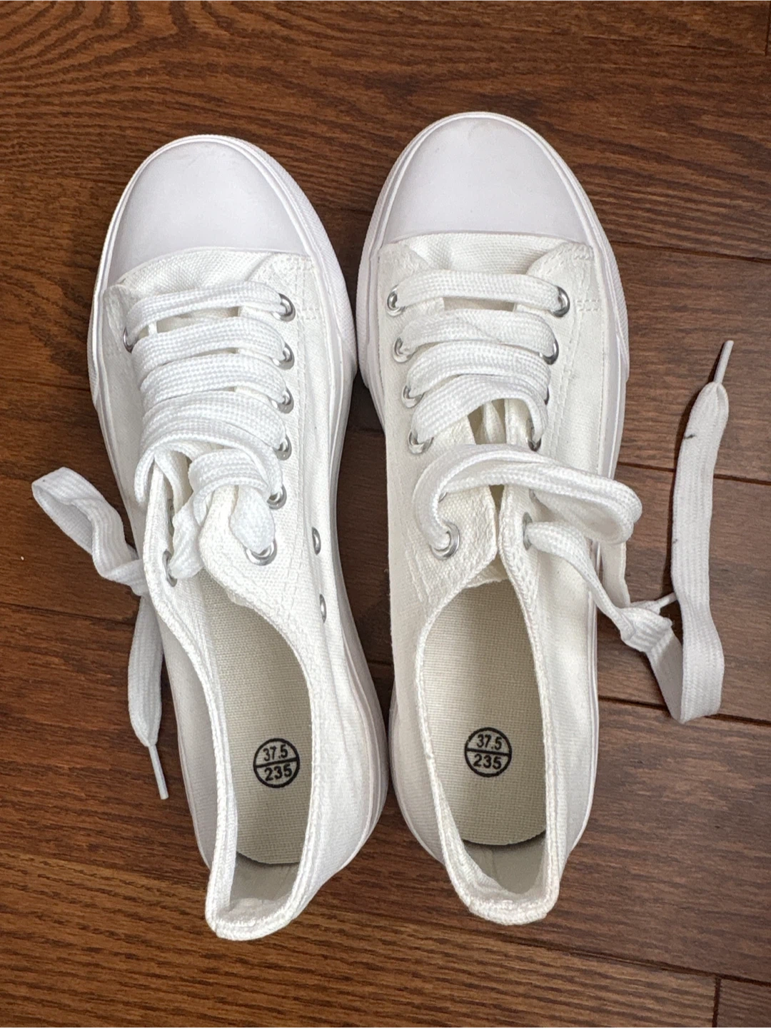 New White canvas low-top sneakers with a rubber sole. Includes an extra pair of white laces. Size is 37.5 EU/235 MM.