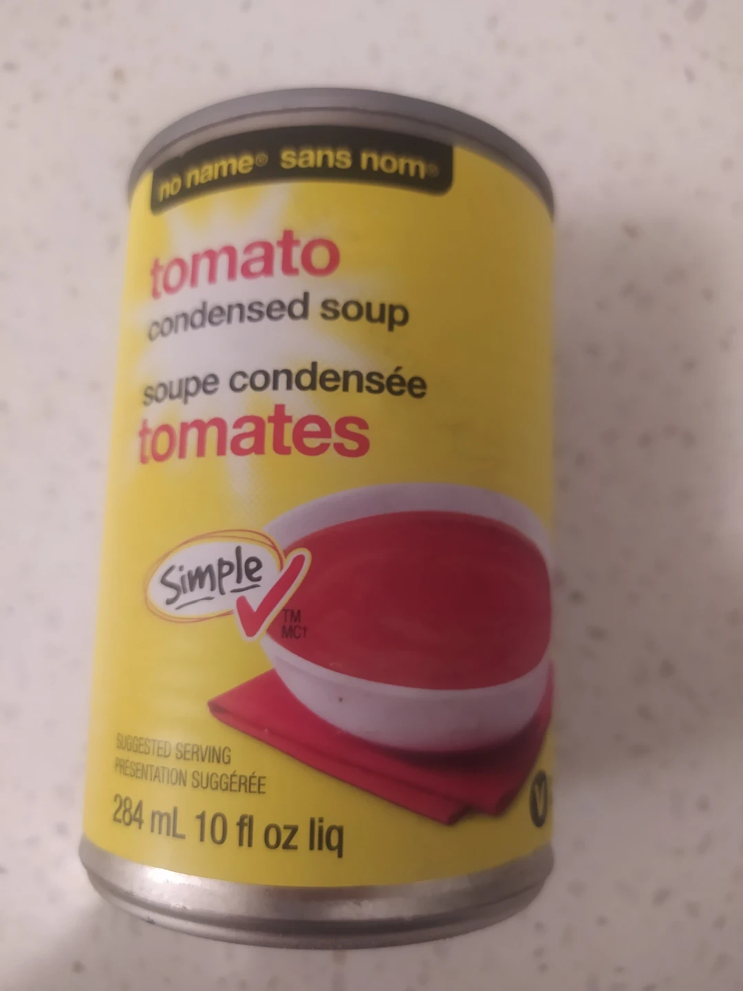 This is a can of No Name tomato condensed soup. It contains 284 mL (10 fl oz liq) of soup. It's a pantry staple for a quick meal.