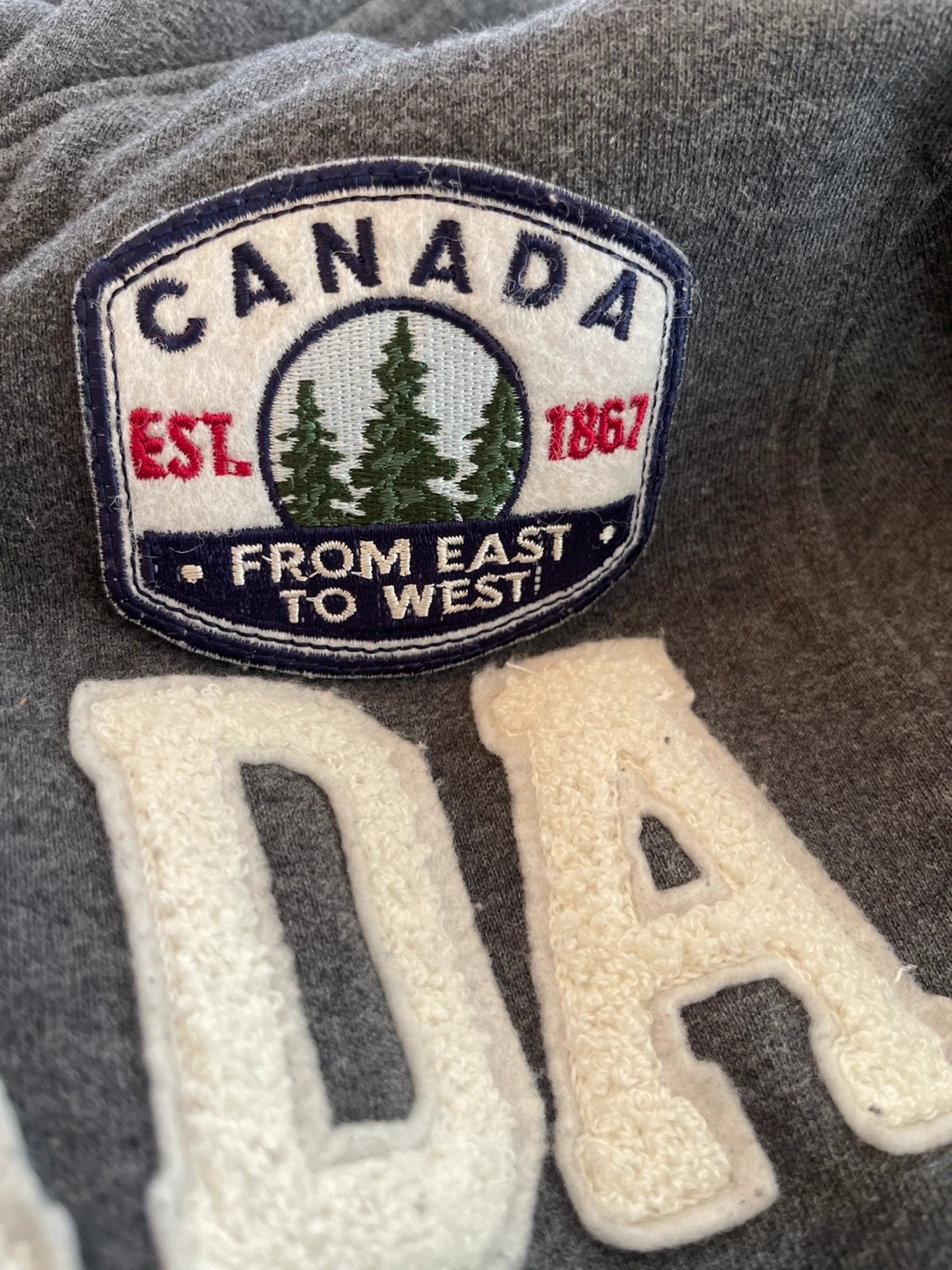 This Joe Fresh zip-up hoodie is grey with "CANADA" lettering and a "Canada Est. 1867 From East to West" patch. It's made of a comfortable fleece-lined material. It's a size XS/TP.