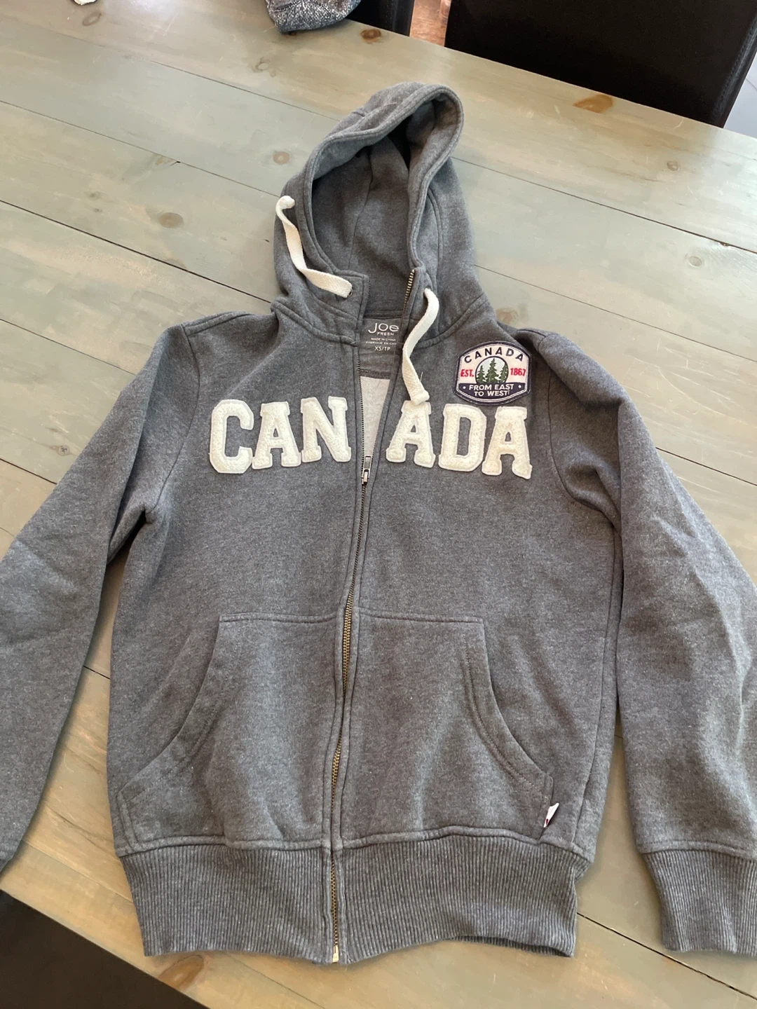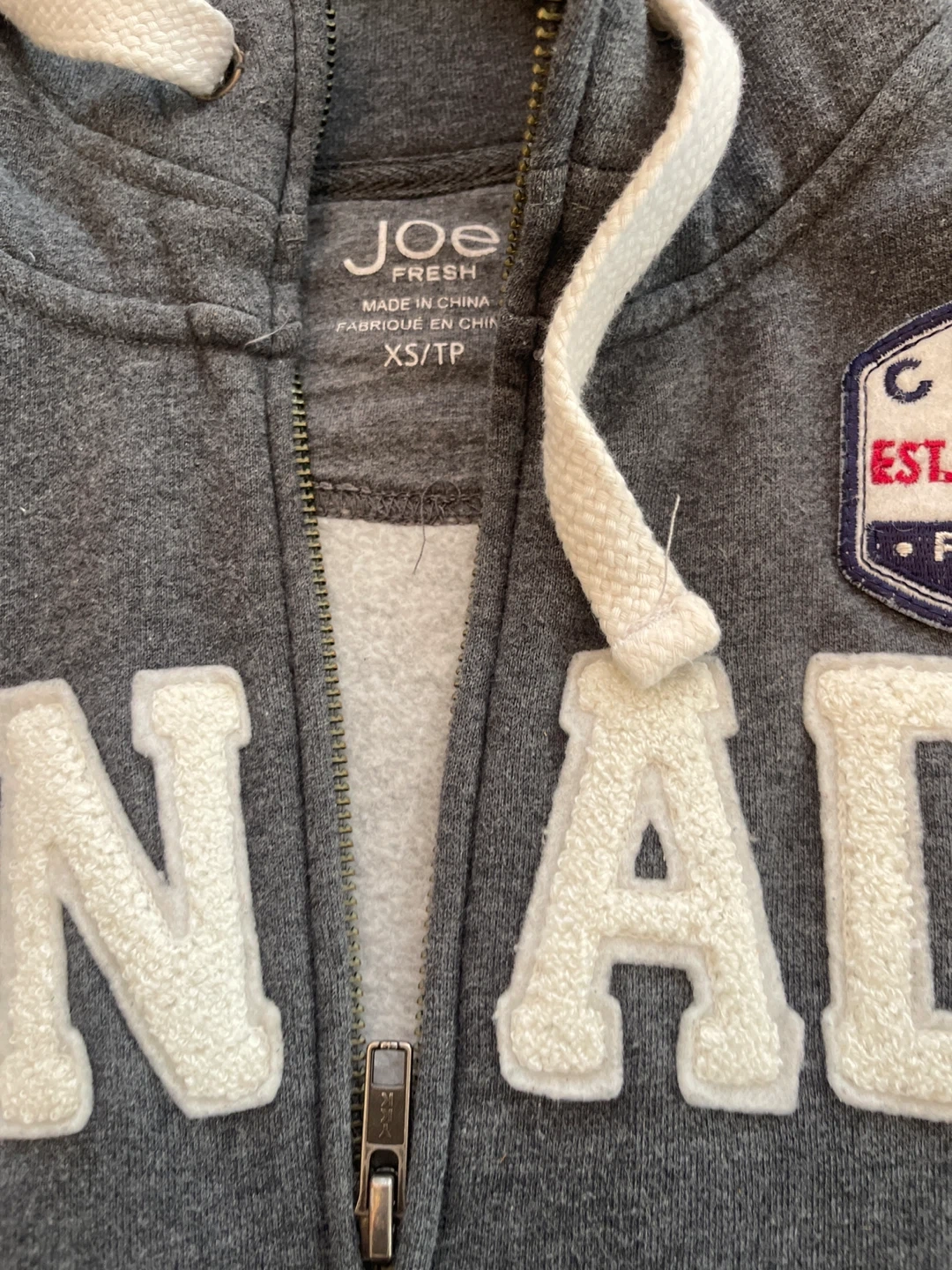 This Joe Fresh zip-up hoodie is grey with "CANADA" lettering and a "Canada Est. 1867 From East to West" patch. It's made of a comfortable fleece-lined material. It's a size XS/TP.