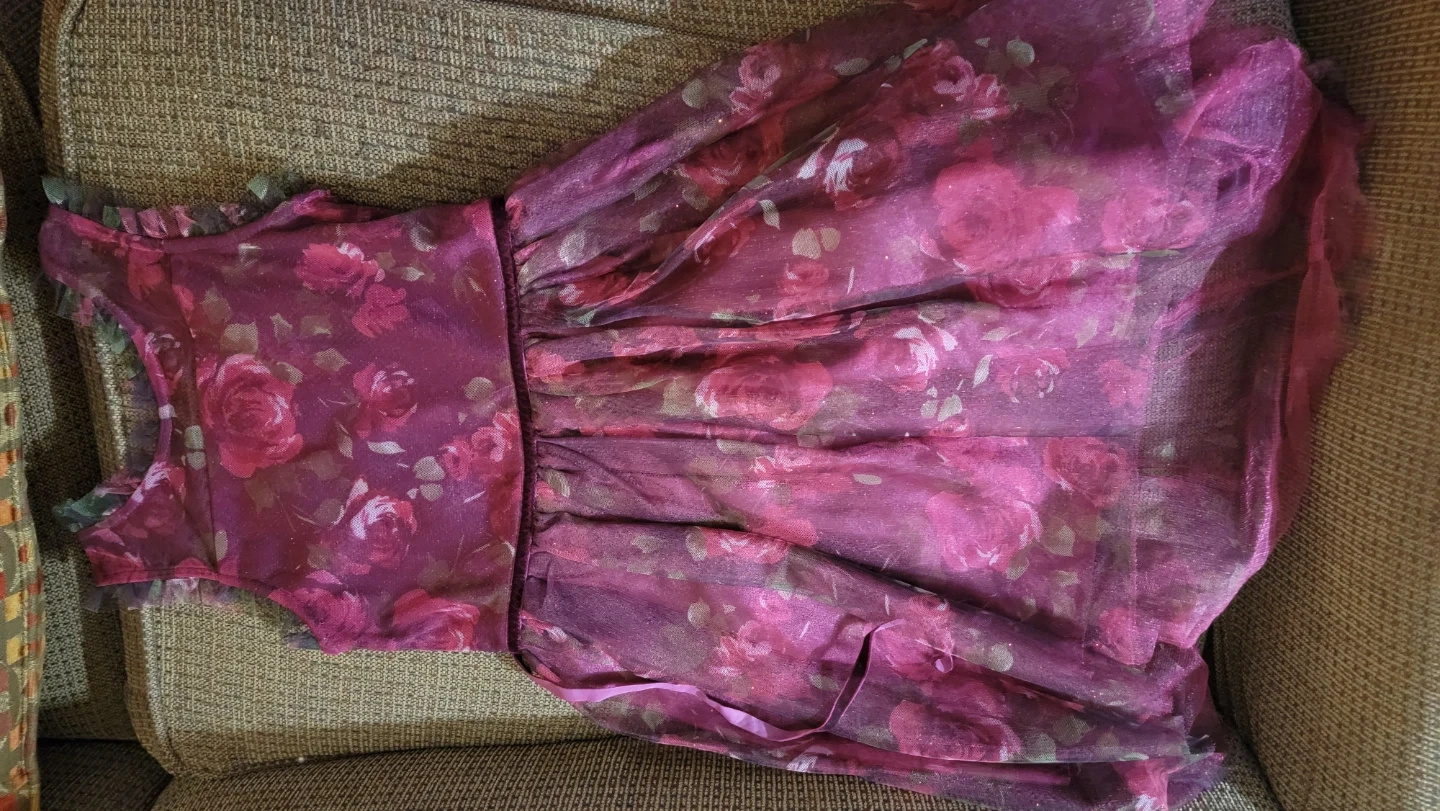 Beautiful sparkling dress featuring a vibrant floral print on a sheer mesh overlay. It has a layered skirt and a comfortable fit for special occasions. Perfect for parties or events! From a no smoke or pets home