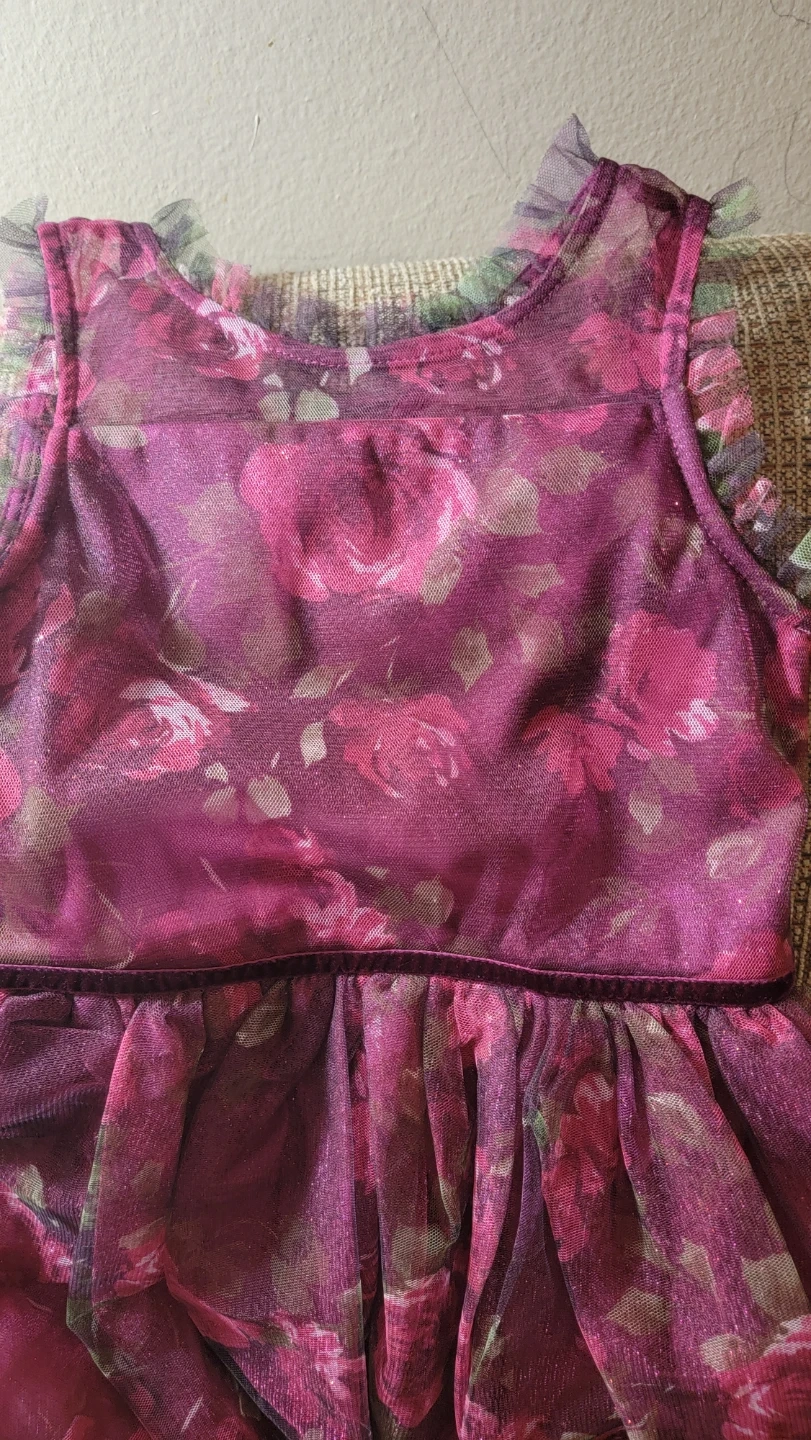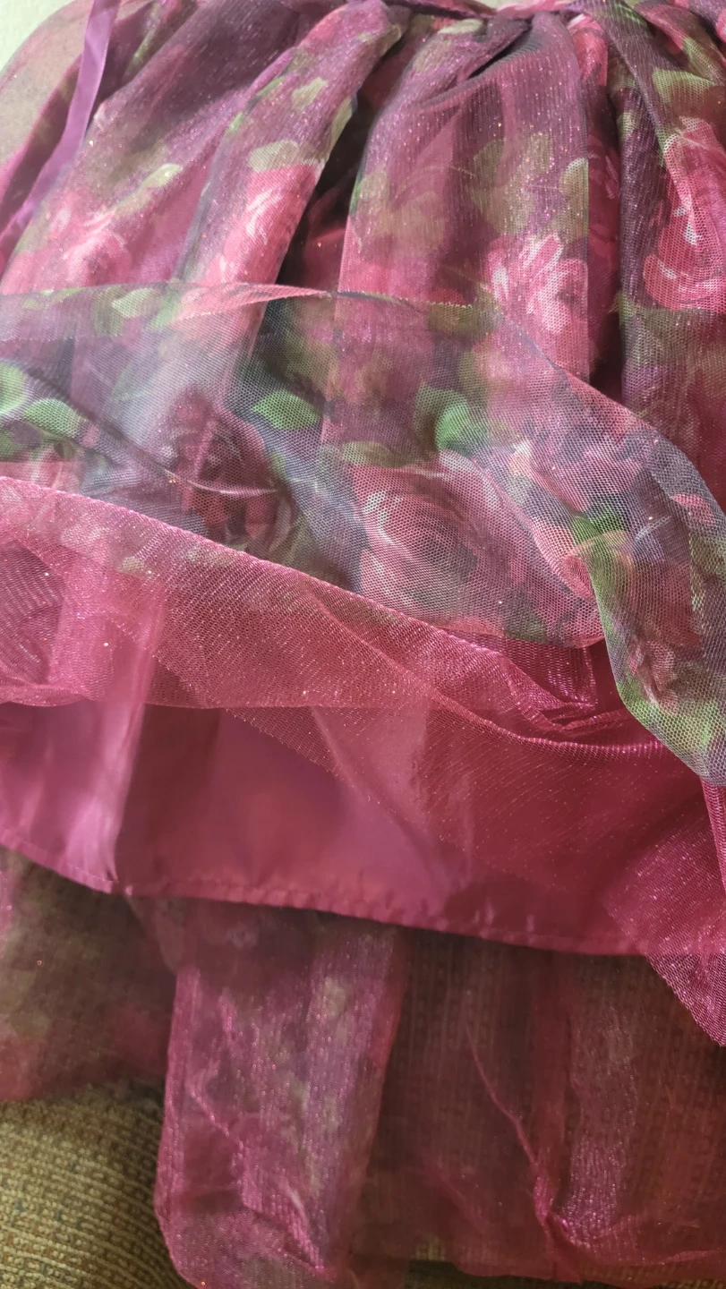 Beautiful sparkling dress featuring a vibrant floral print on a sheer mesh overlay. It has a layered skirt and a comfortable fit for special occasions. Perfect for parties or events! From a no smoke or pets home