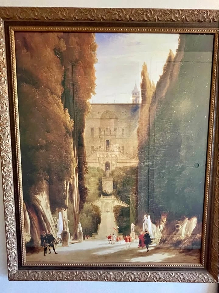 Very large framed print of the painting "In the Park of the Villa d'Este" by German Romantic painter Carl Blechen. Dimensions are 40"W x 48"H. Pickup only at Dundas and Roncesvalles.
