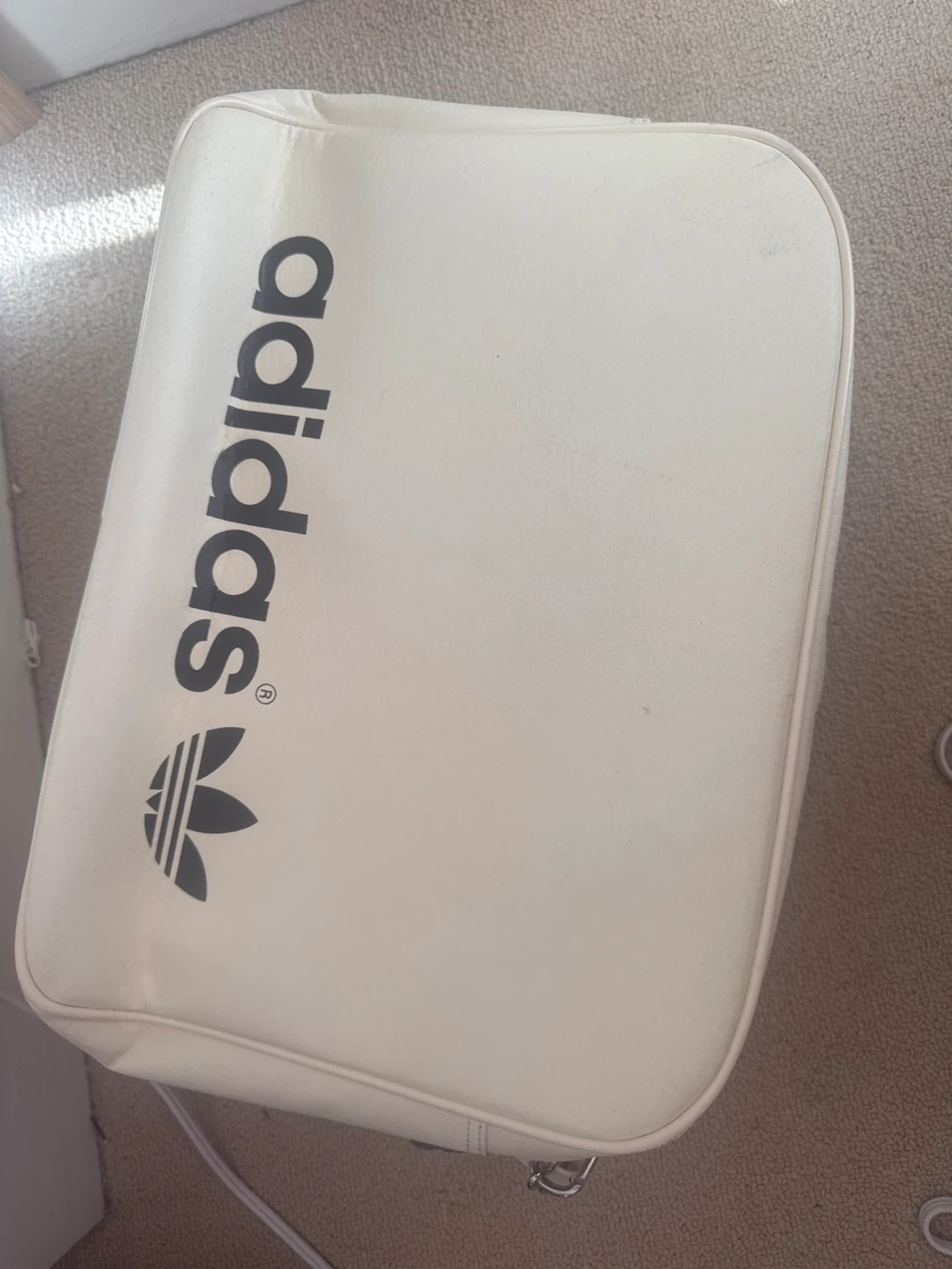 Vintage - Cream-coloured Adidas satchel bag with iconic trefoil logo. It features a zippered main compartment and an external pocket. Durable synthetic material is slightly cracked on handle and one side. Has a shoulder strap available. Best offer - not sure what it’s worth.
