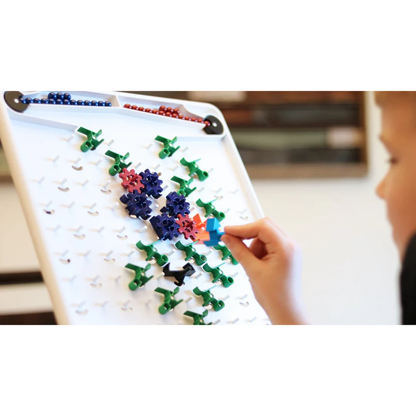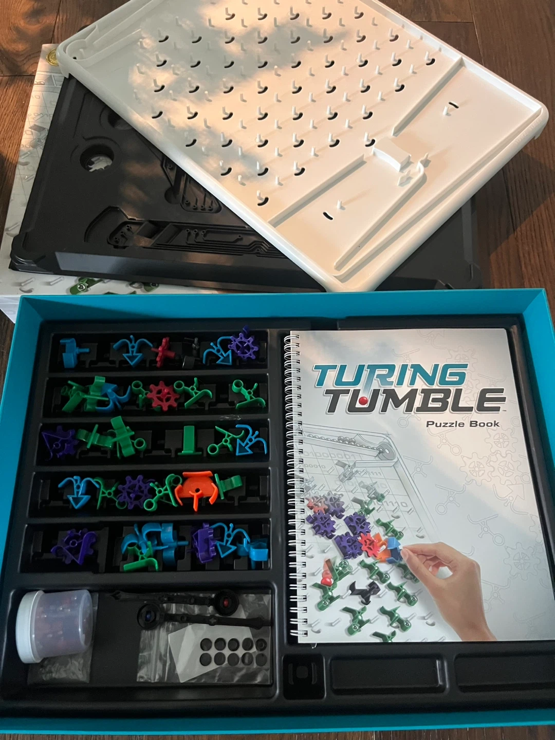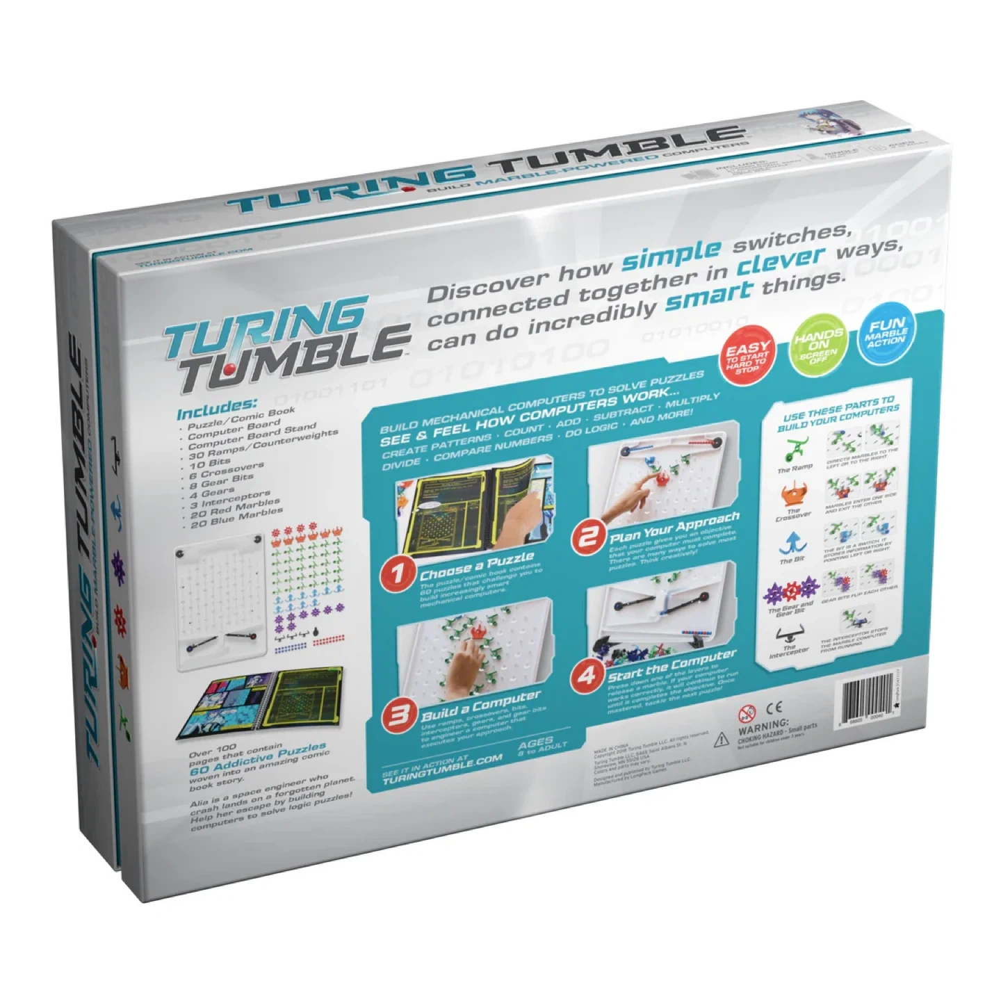 Turing Tumble is a new type of game where players (ages 8 to adult) build mechanical computers powered by marbles to solve logic puzzles. Use ramps, crossovers, bits, interceptors, gears, and gear bits to build marble-powered computers that can generate patterns, do logic, count, add, subtract, multiply, divide, and much, much more. Discover how computers work! Voted best toy of the year! Going for $50-$100 used on marketplace.