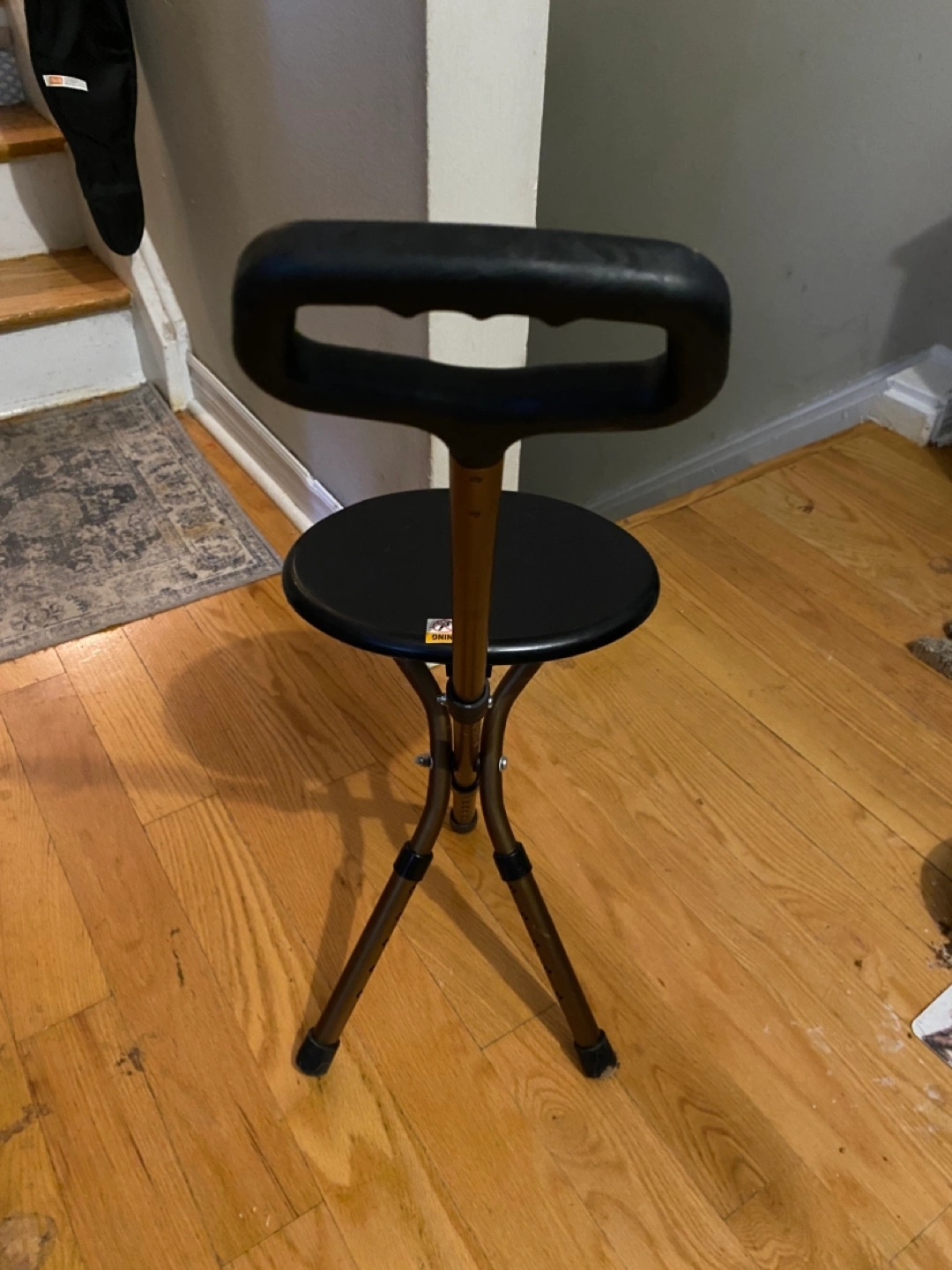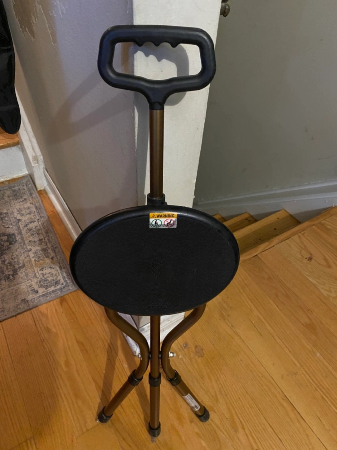 Portable folding cane with a built-in seat. Lightweight and easy to carry. Great for seniors or those with mobility issues. Good condition.