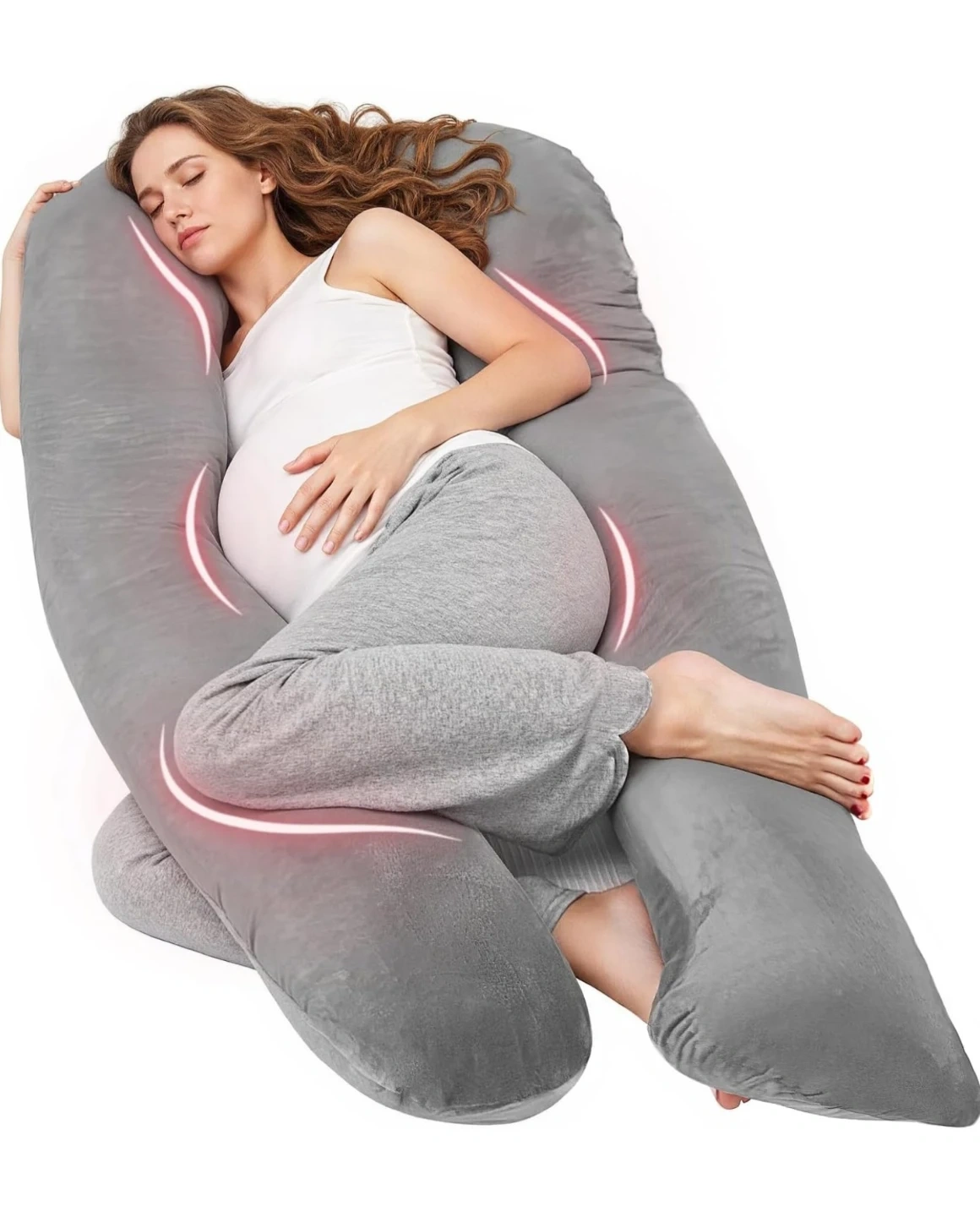 U-shaped Maternity Pillow Support for Back, HIPS, Legs for Pregnant Women, with Washable Velvet Cover (Grey). It's made with a soft, grey velour cover and a zippered closure for easy washing.
