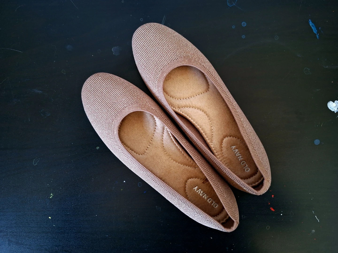 Super comfortable knit ballet flats from Old Navy in a brown/dark tan colour. (For some reason, they look more pink in these pics). These shoes feature a flexible knit upper and a cushioned insole for all-day wear. They're a versatile choice for casual or dressy occasions.