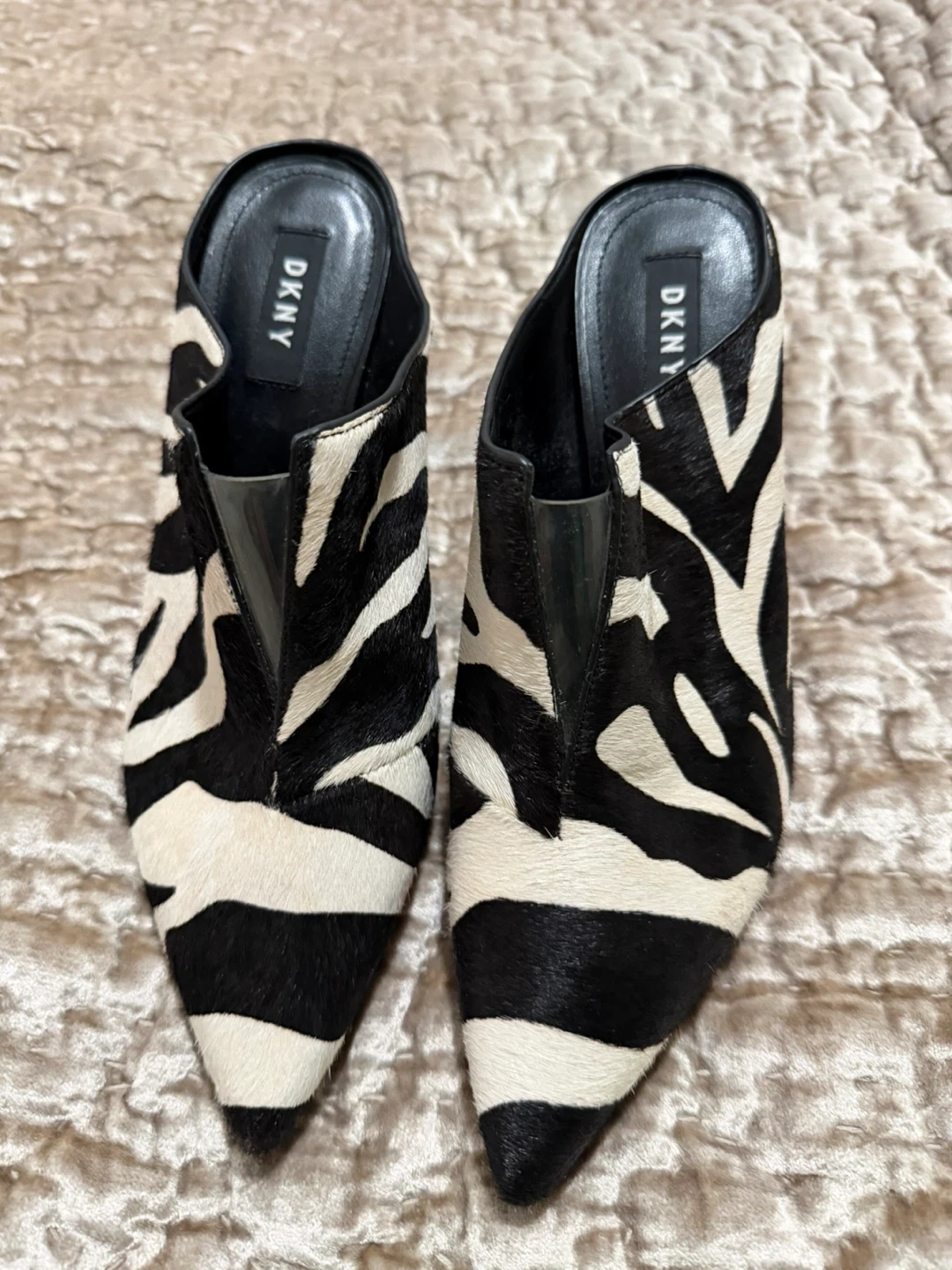 Stylish DKNY heels in a striking zebra print! These are a size 8M and feature a sleek, pointed toe design. Perfect for adding a bold touch to any outfit