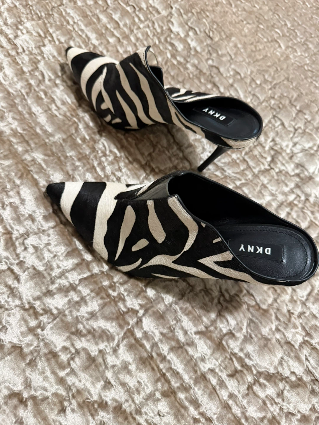 Stylish DKNY heels in a striking zebra print! These are a size 8M and feature a sleek, pointed toe design. Perfect for adding a bold touch to any outfit