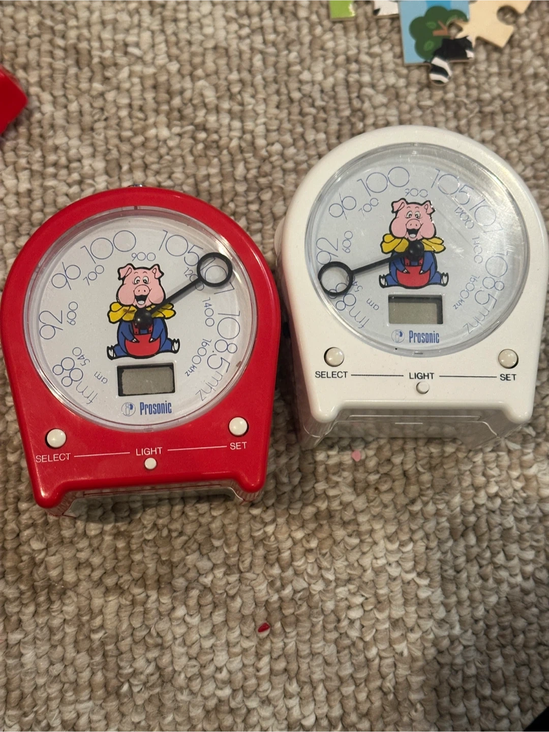 Selling cute alarm clocks featuring a piggy design! One is red and the other is white. Great for kids room too.