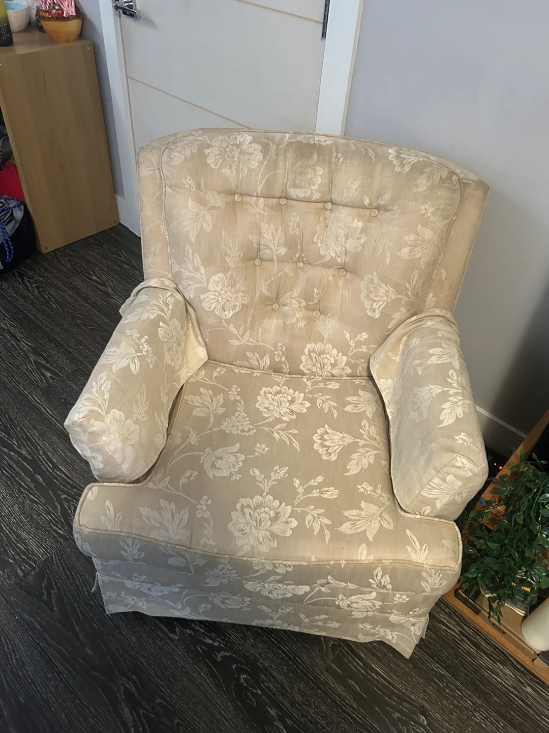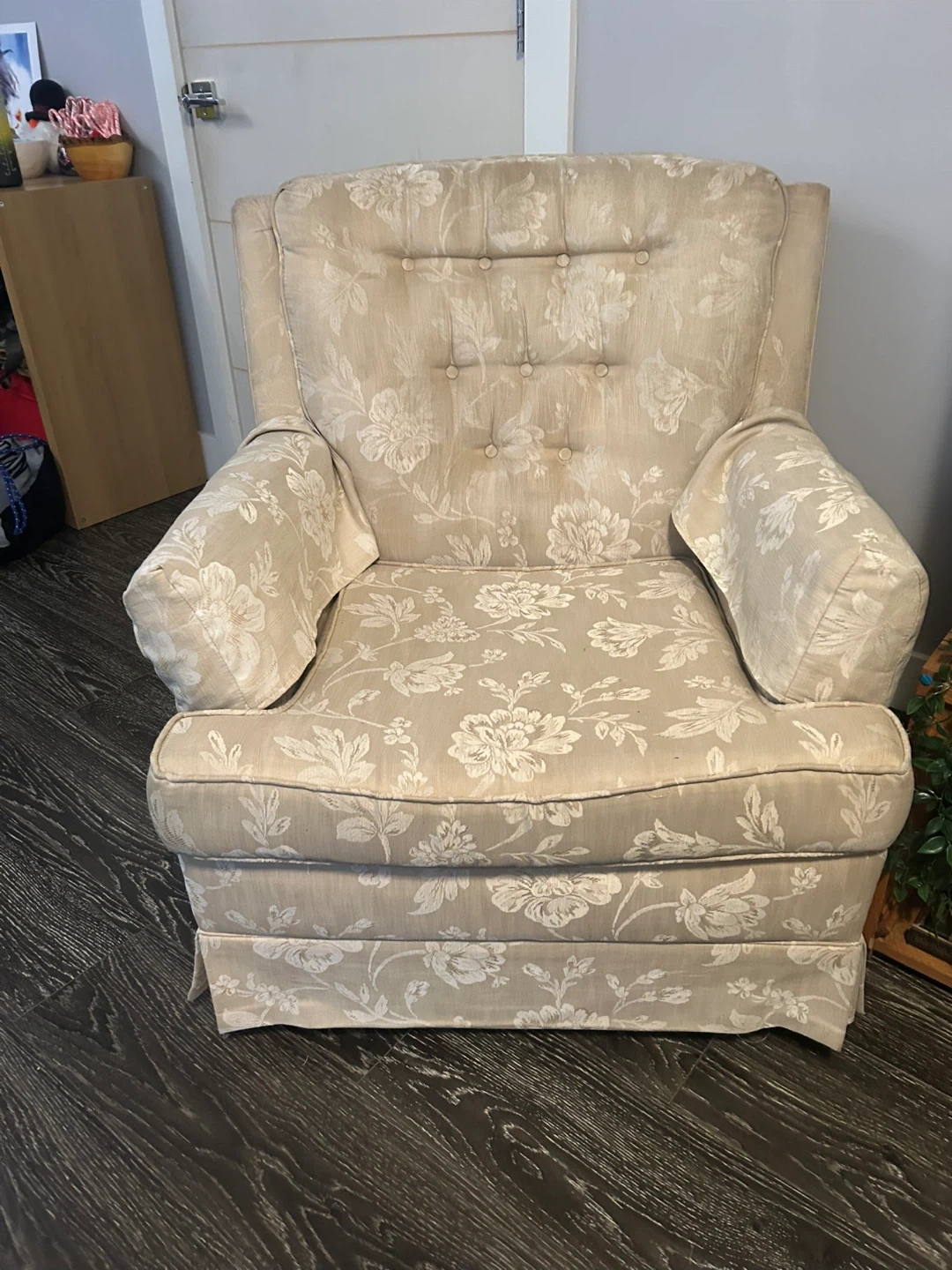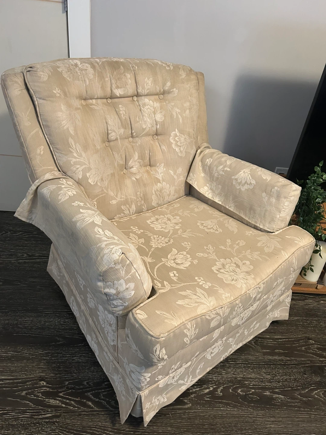 This armchair features a lovely floral pattern. It would be a great addition to any living room or cozy reading nook. The chair is in good condition and ready for a new home!