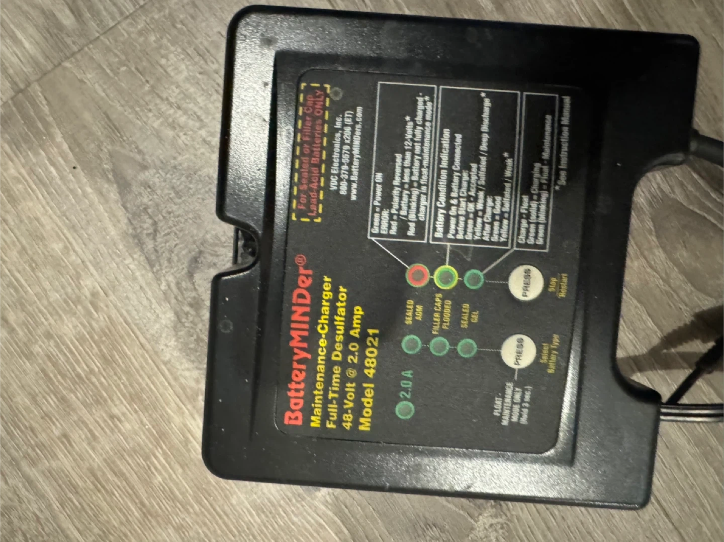 This BatteryMinder maintenance charger is a full-time desulfator for 48-volt batteries. It features a 2.0 Amp output and comes with an instruction manual. It's designed for sealed or flooded lead-acid batteries.