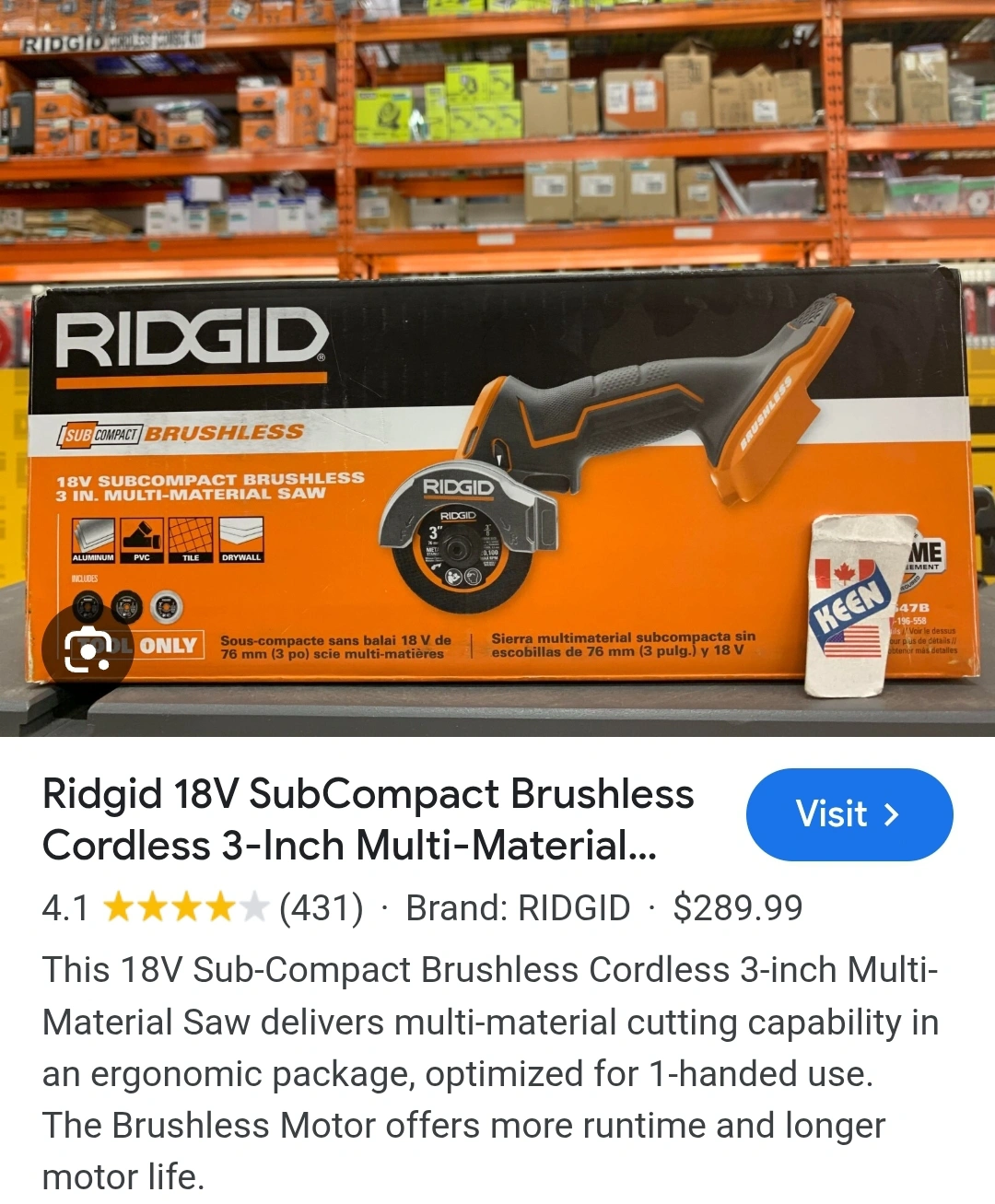 Selling a Ridgid 18V SubCompact Brushless 3-Inch Multi-Material Saw. It delivers multi-material cutting capability in an ergonomic package, optimized for 1-handed use. The Brushless Motor offers more runtime and longer motor life. It comes in its original box! does not come with charger or battery.