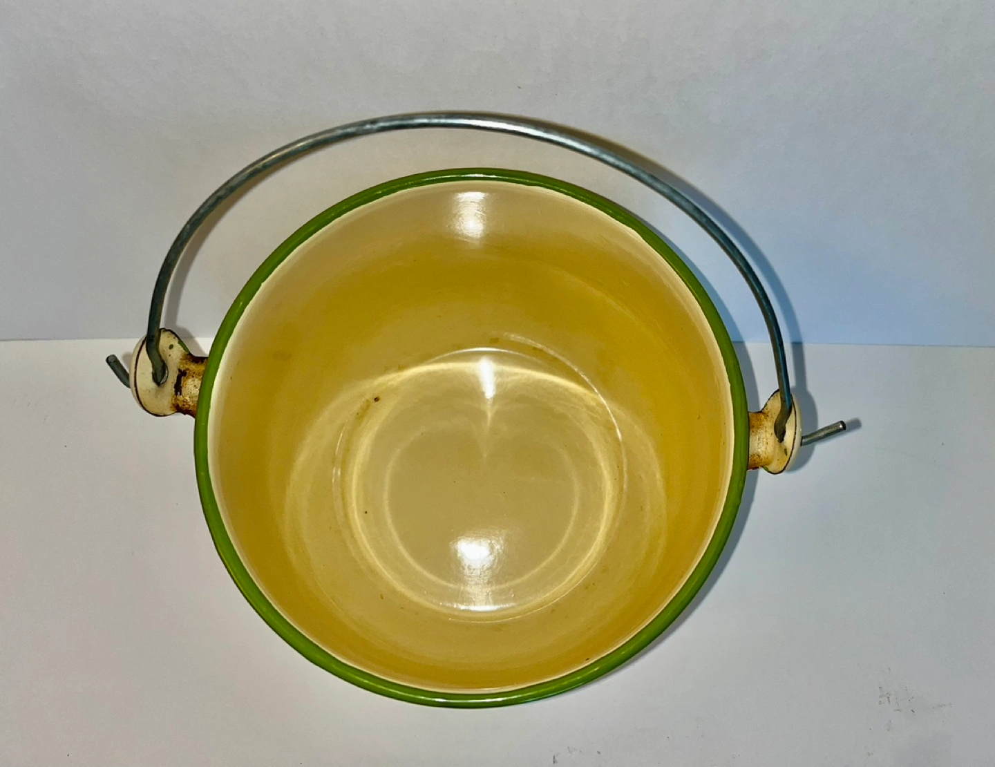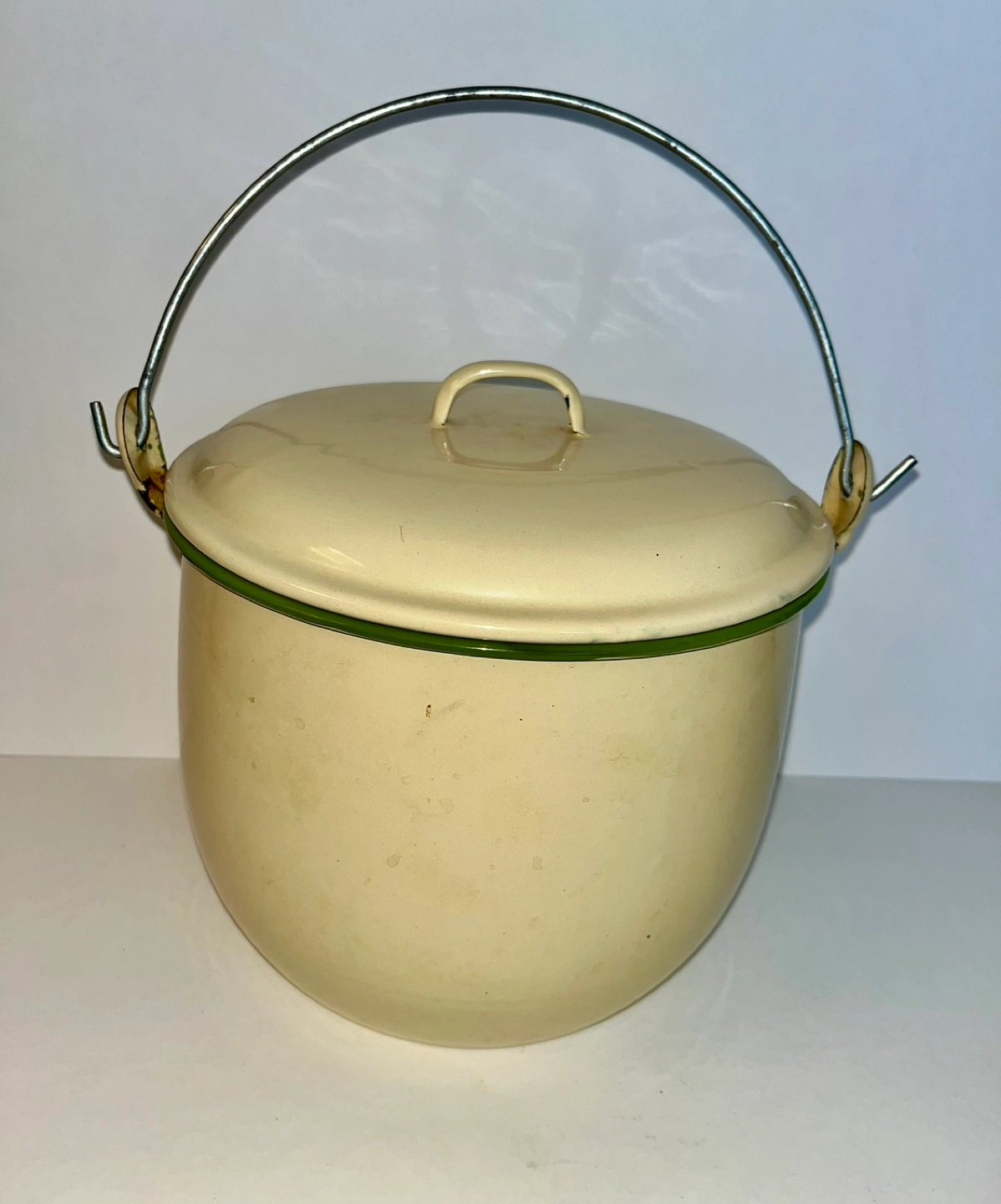Cream coloured enamelware pot with carrying handle. Green rim. Matching lid. 8” diameter and 6” deep. Great condition.