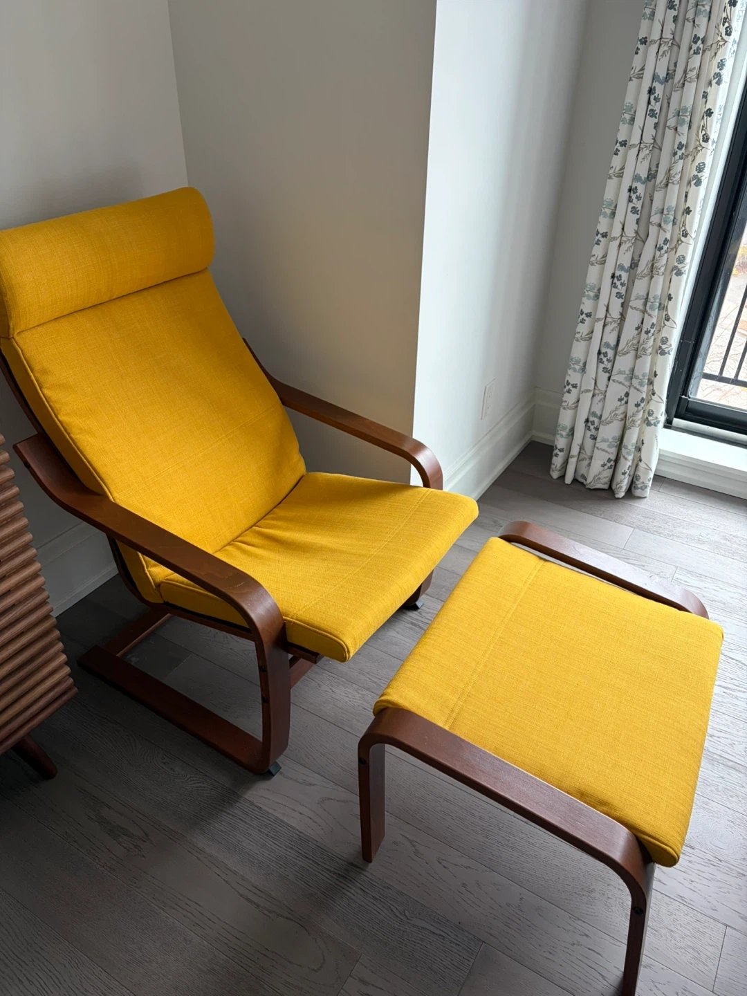 This yellow lounge chair comes with a matching ottoman. It features a wooden frame and upholstered cushions. A comfortable addition to any living space!