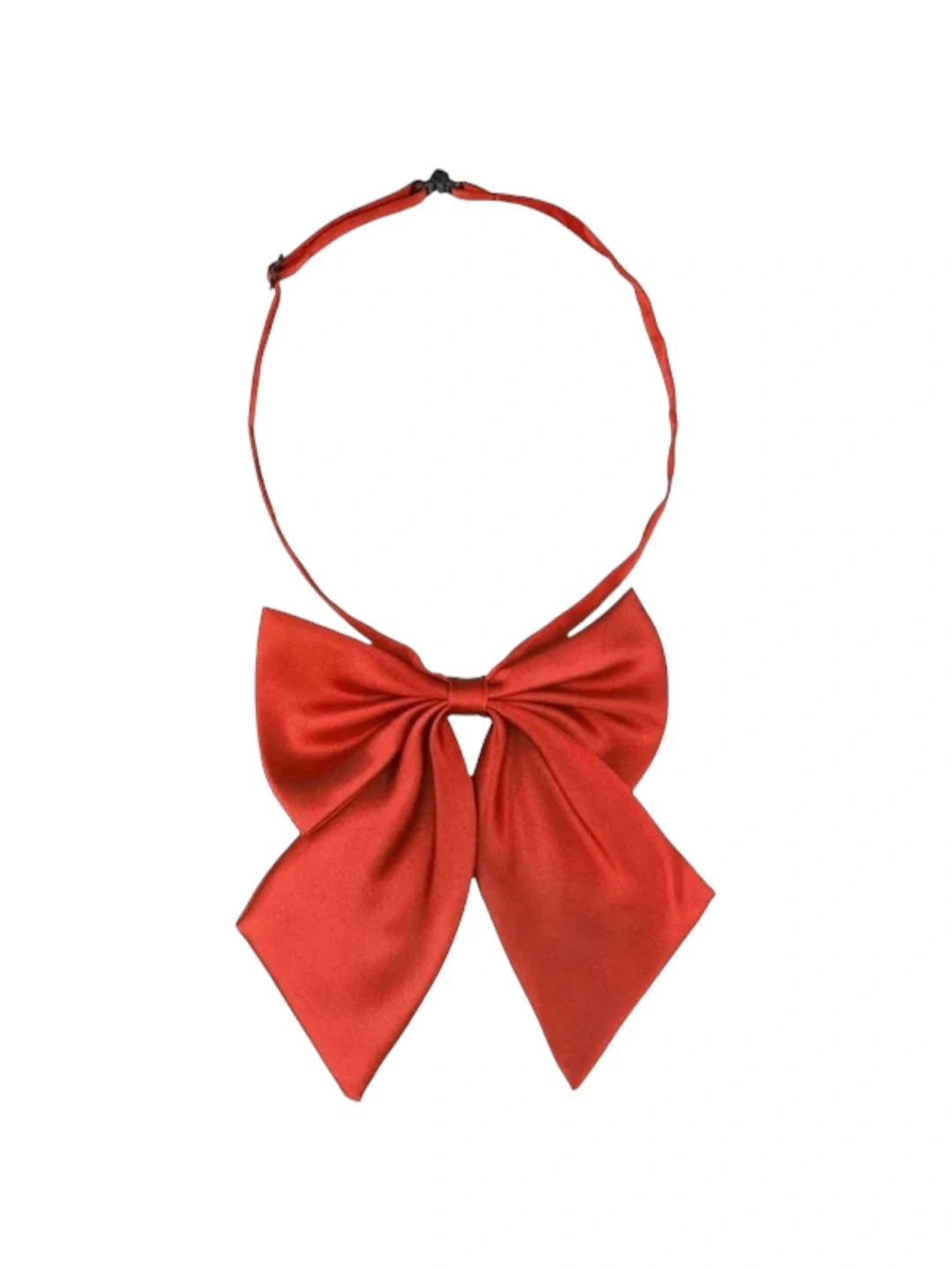 Cute oversized red bow tie accessory with a classic satin finish and adjustable neck strap. This pre-tied bow adds a playful statement to blouses, dresses, polos, or costume looks. The bold shape and vibrant color make it perfect for styling outfits with a fun, coquette-inspired touch.