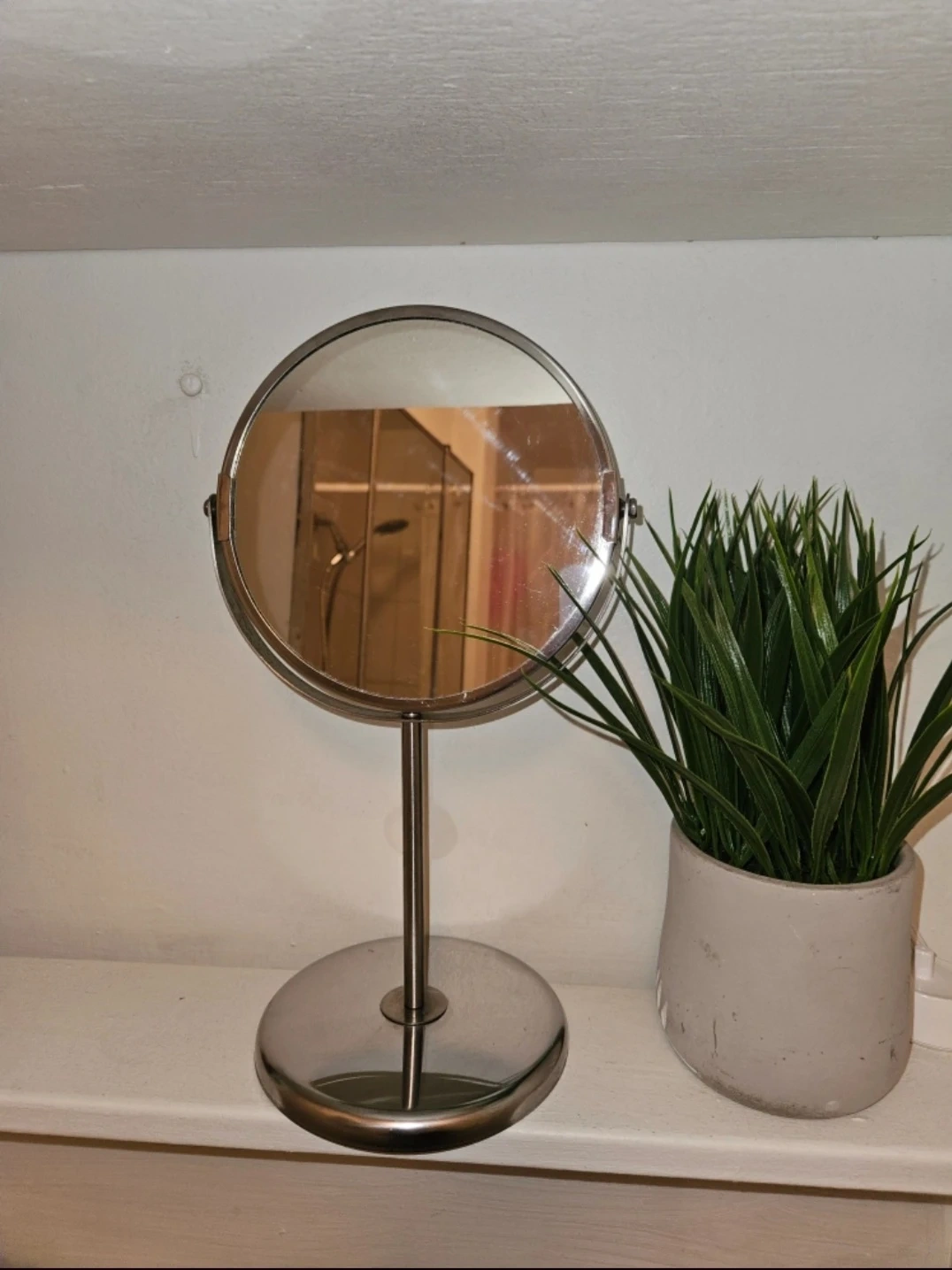 Selling a silver vanity mirror. It's in great shape and would be perfect for a bathroom or bedroom. It's a simple and stylish design that would fit in with any decor.