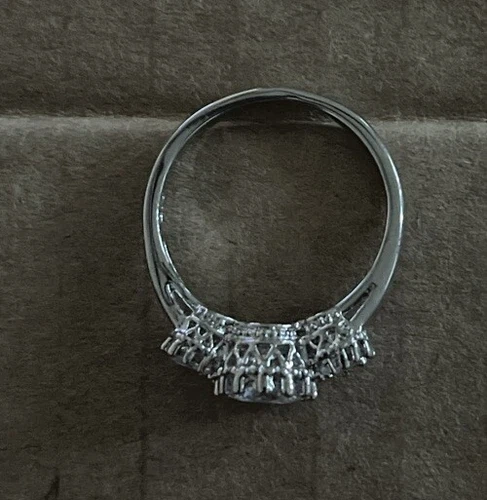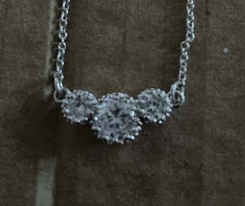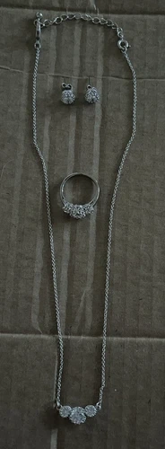 Silver toned cubic zirconia necklace, earrings, and ring set. Ring is a size 7.5 or an 8. It will be cleaned with an ultrasonic cleaner before meeting.