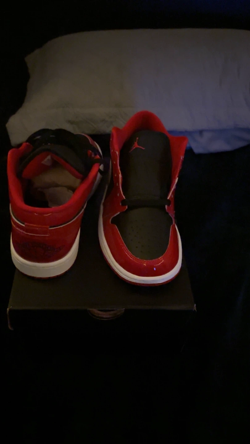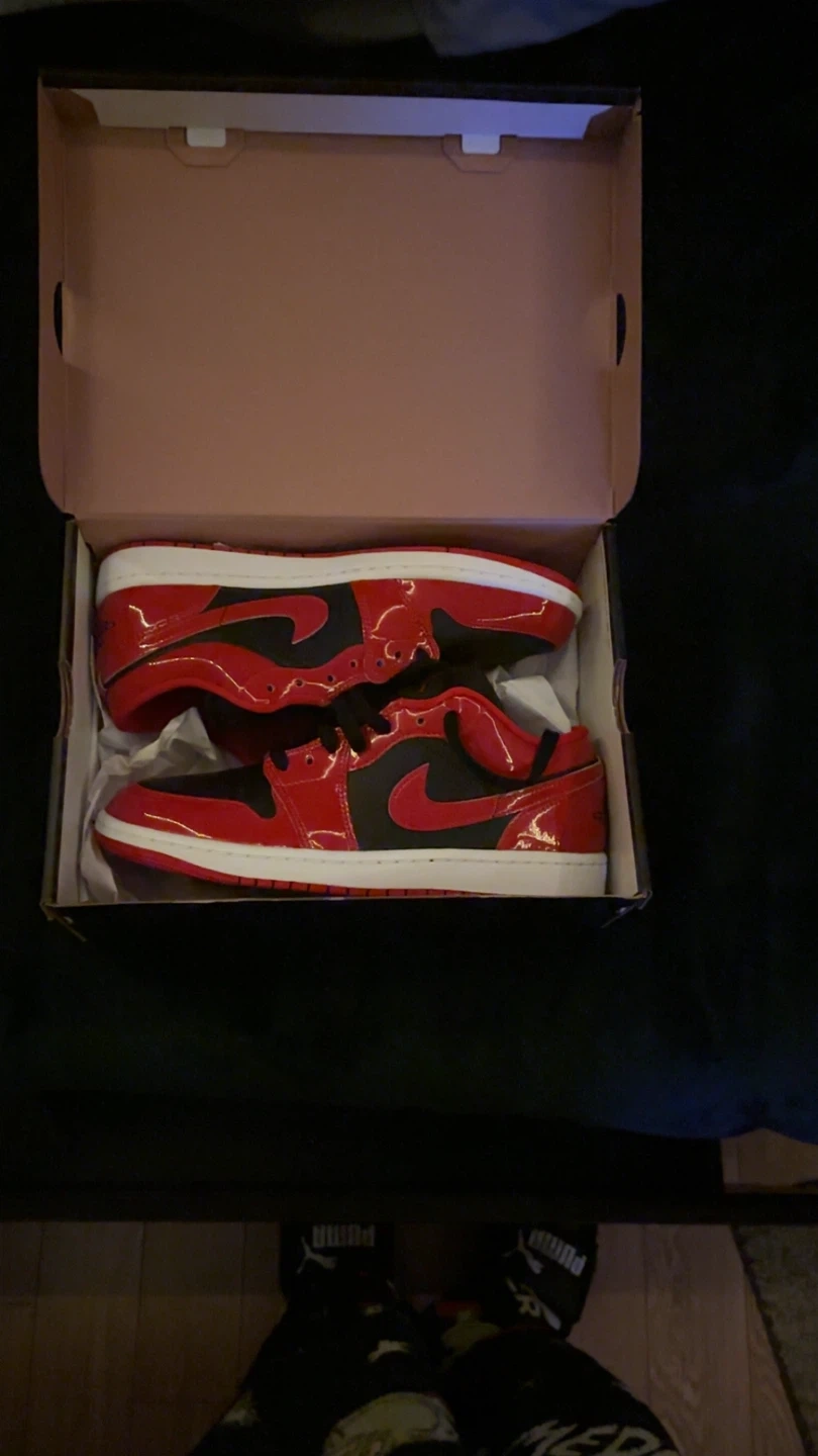These Air Jordan 1 Low sneakers come in a striking red patent leather with black accents. They're in their original box, ready for a new owner. These kicks are perfect for making a statement!