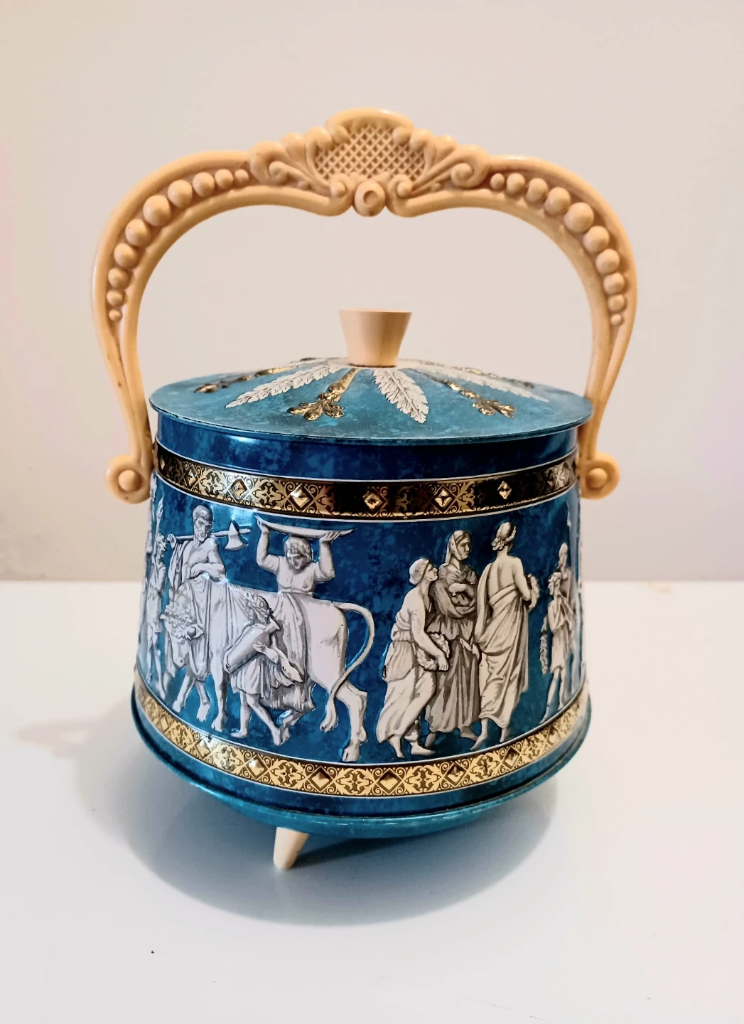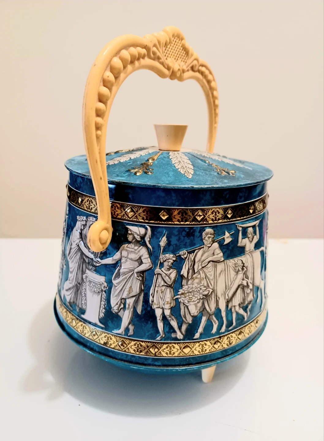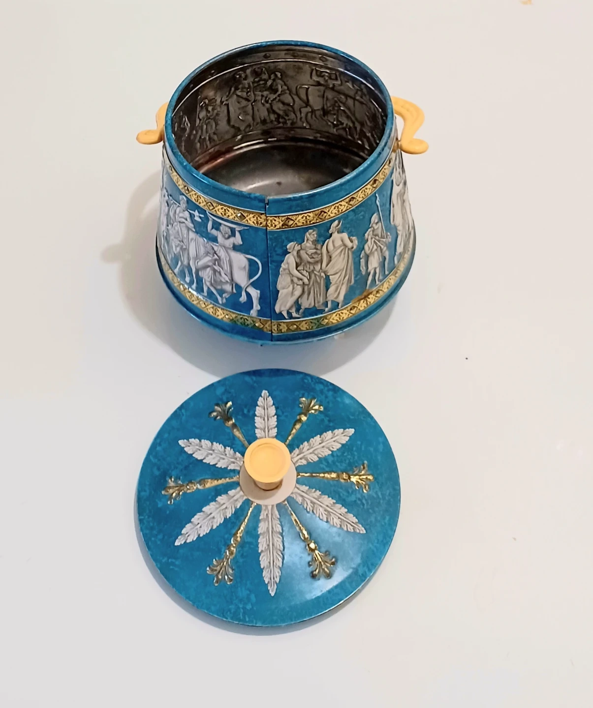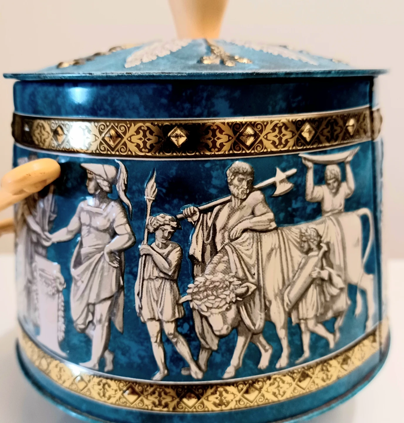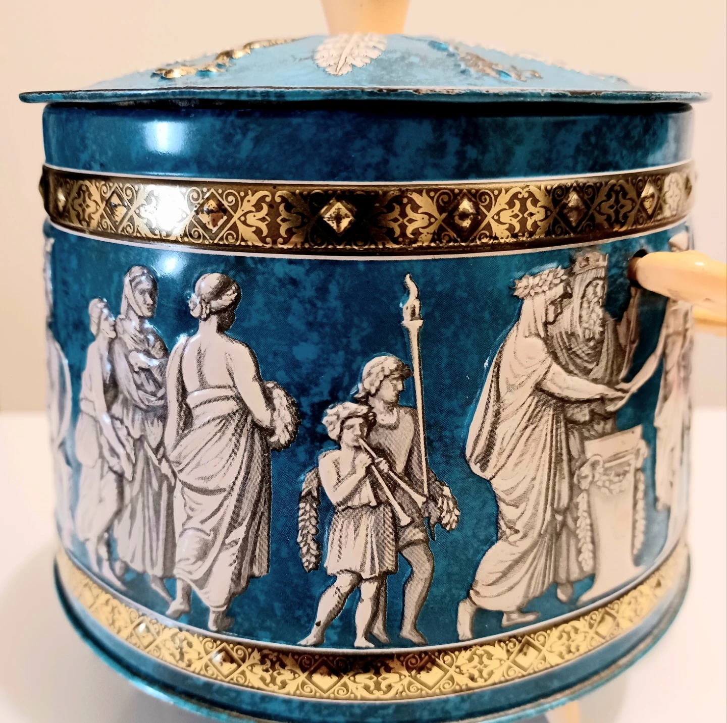 Design: The tin features a marbled blue finish with embossed figures representing ancient Greek or Roman themes, such as goddesses or classical processions.