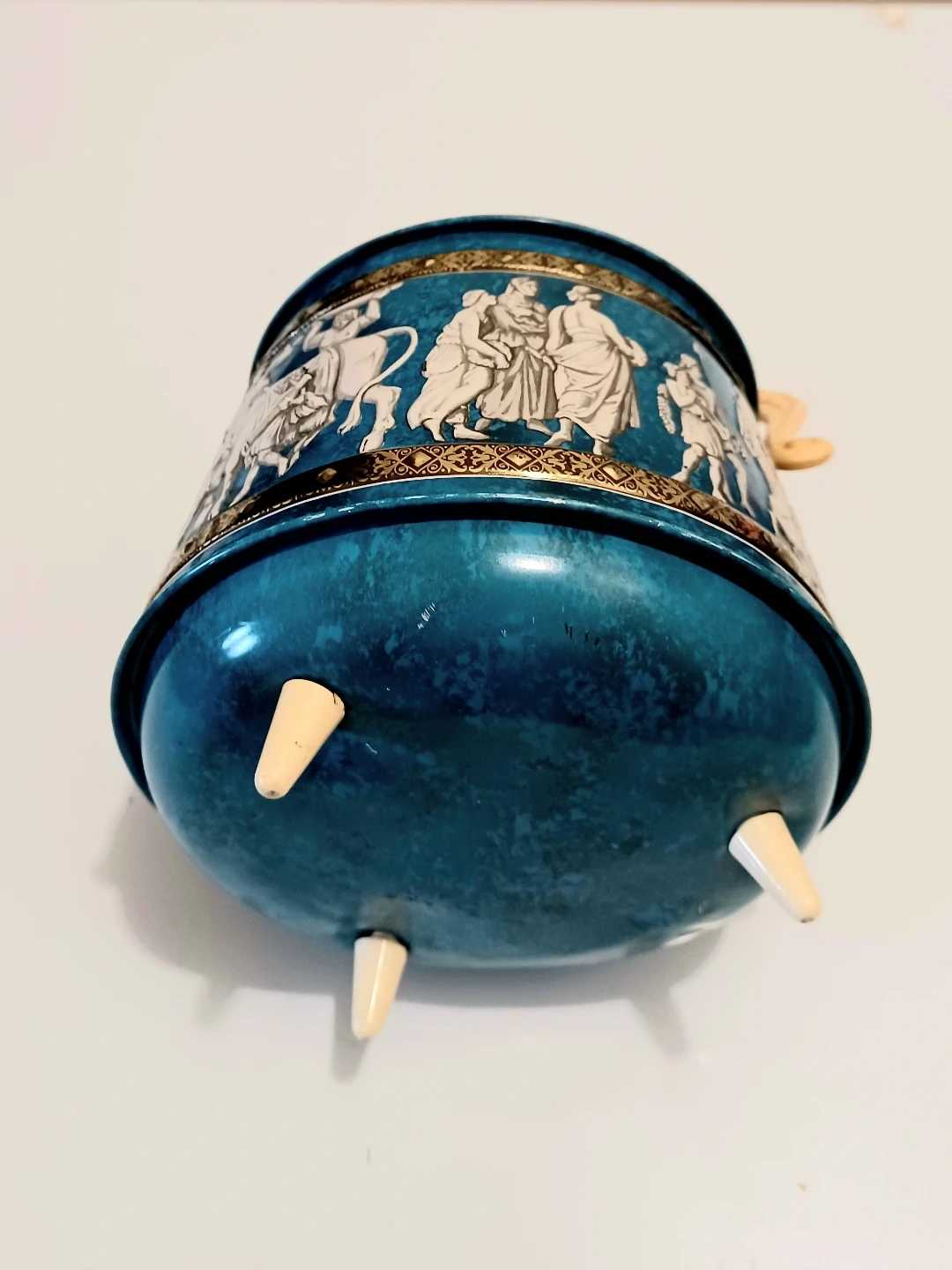 Design: The tin features a marbled blue finish with embossed figures representing ancient Greek or Roman themes, such as goddesses or classical processions.