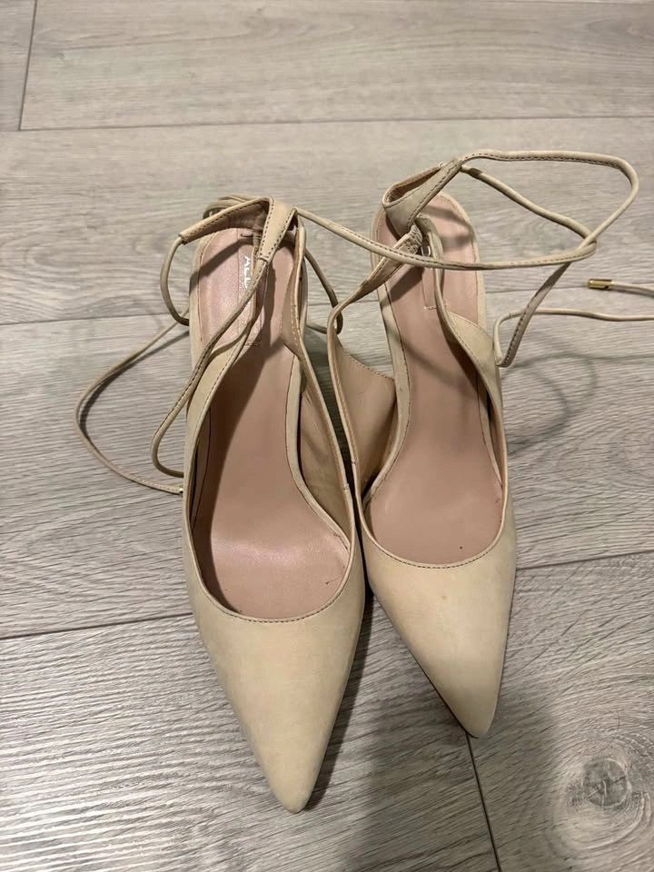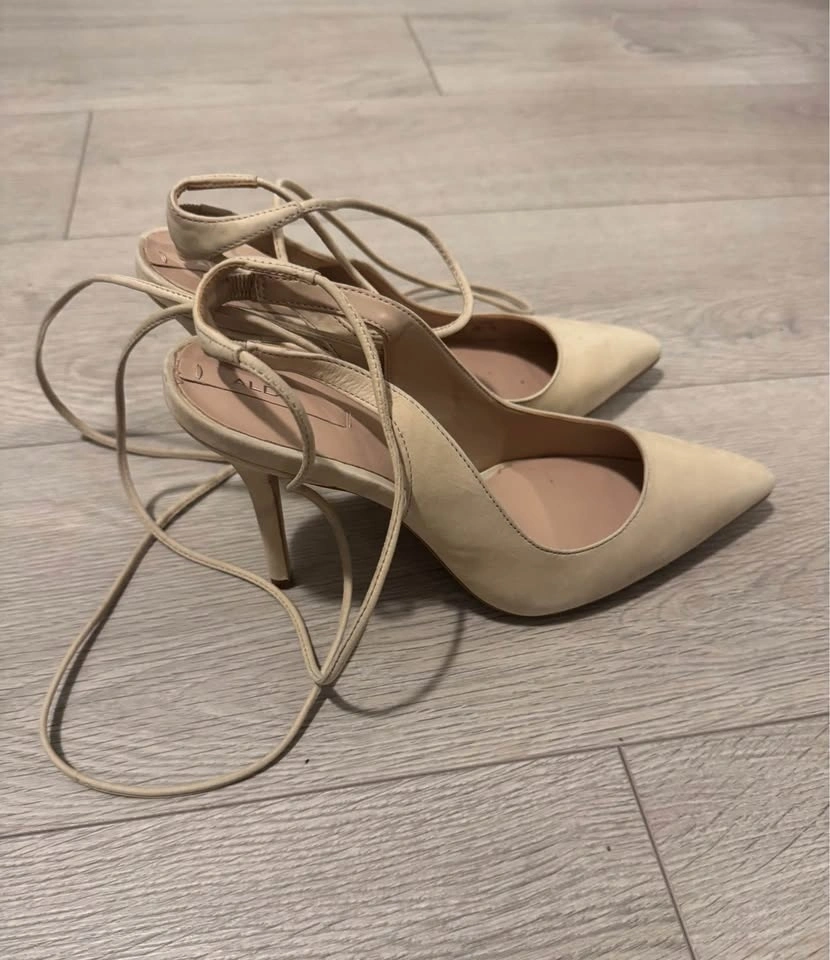 Chic ALDO nude lace-up heels with a pointed toe and stiletto heel. Material is suede-like. Perfect for dressing up any outfit.