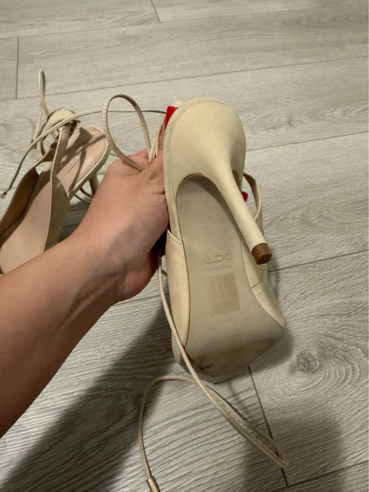 Chic ALDO nude lace-up heels with a pointed toe and stiletto heel. Material is suede-like. Perfect for dressing up any outfit.