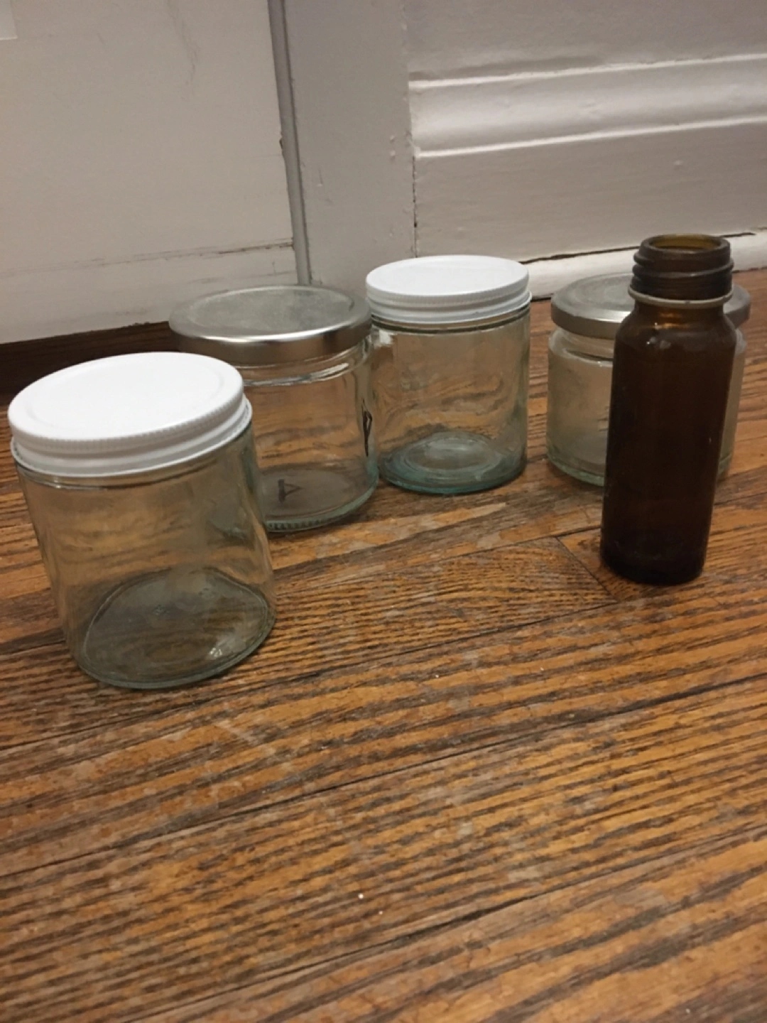 Four assorted glass jars with lids. Includes two jars with white screw-top lids, one jar with a silver screw-top lid, and one small amber bottle. Great for storage or craft projects!