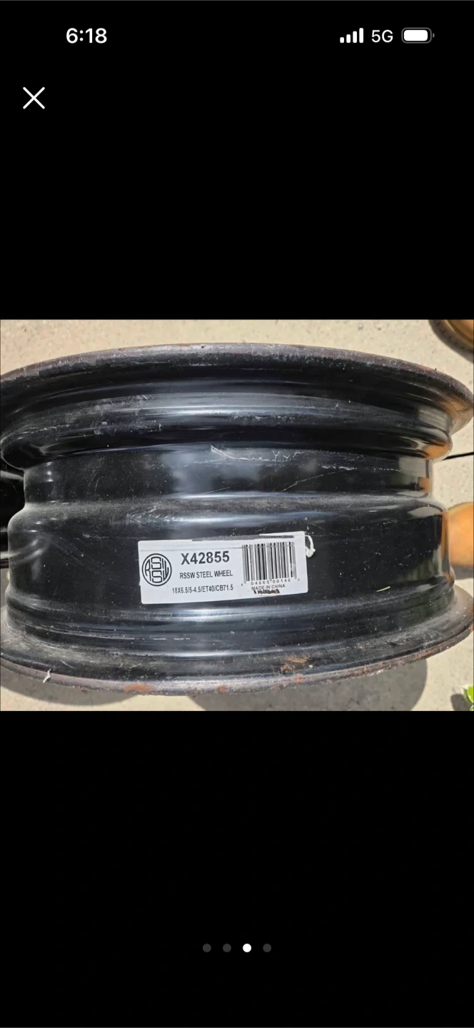 Set of four black steel wheels. Includes original labels with part number X42855. Size is 15X6.5J, 5-4.5 / ET40 / CB71.5. Some rust and wear present.