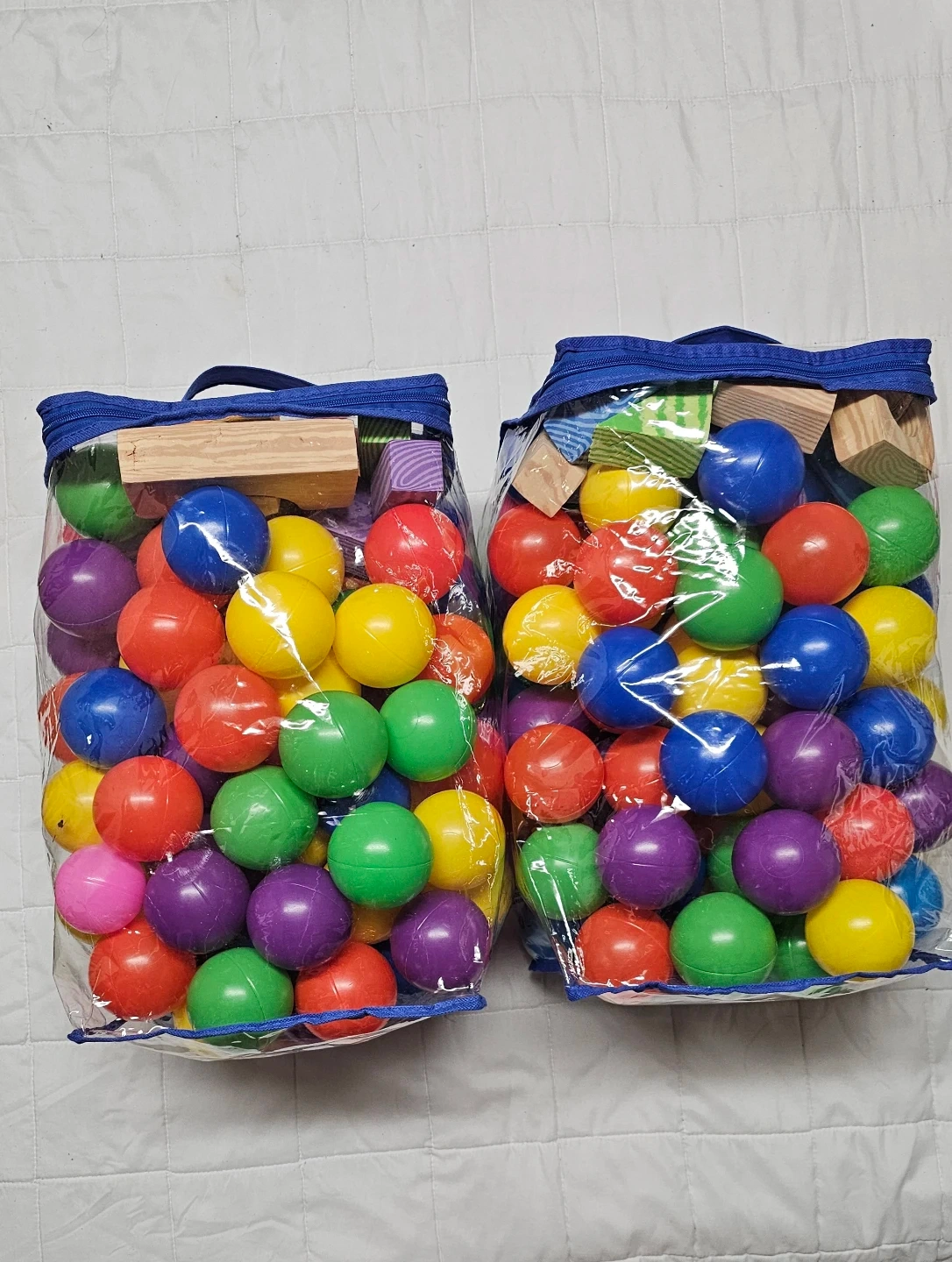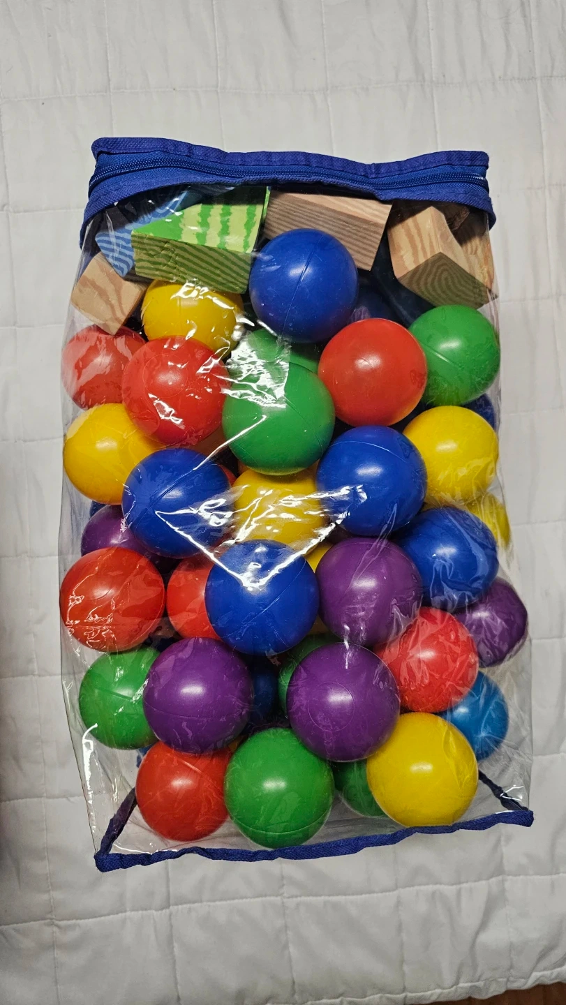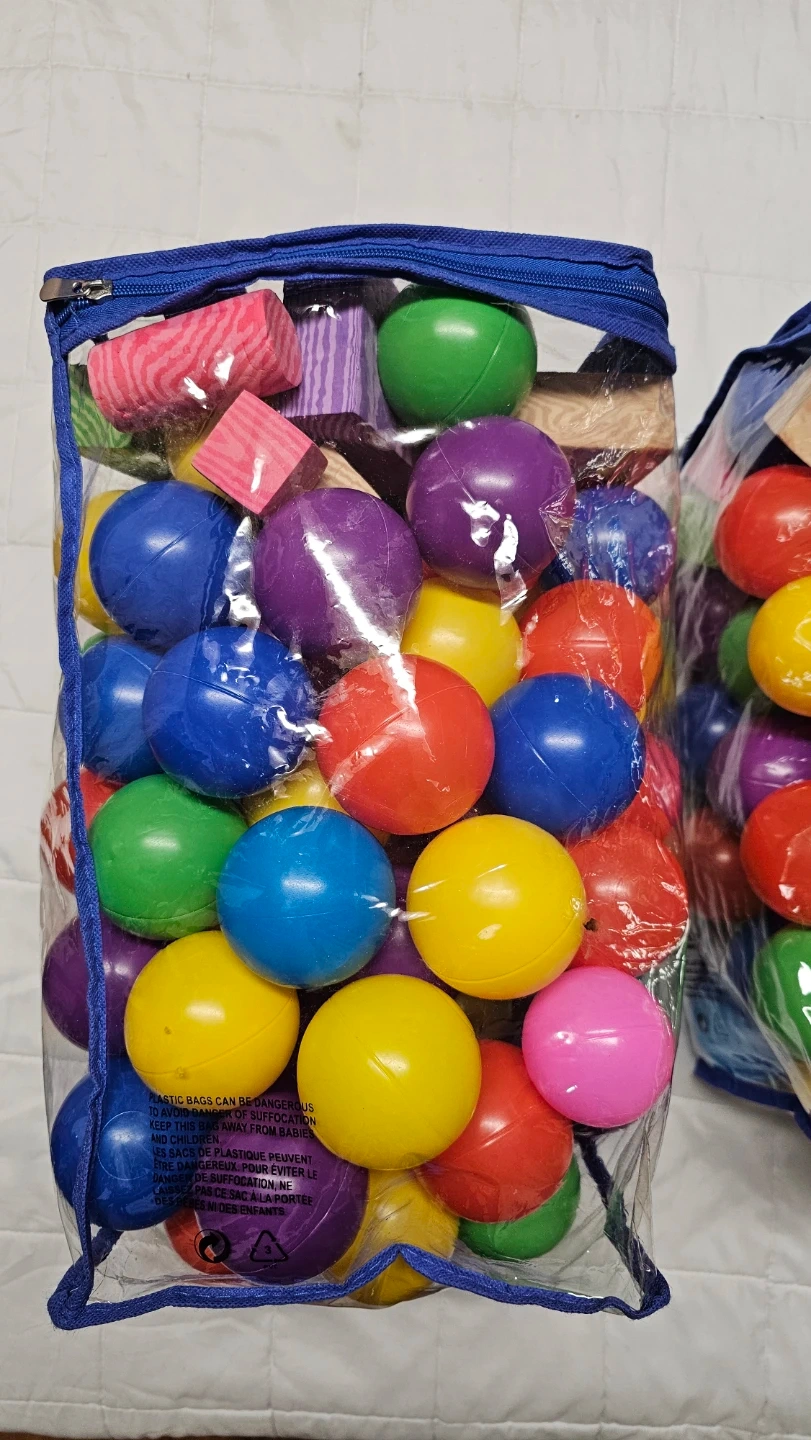 This bag contains a mix of colourful plastic balls and soft building blocks. They're great for kids' playtime and creative building. Plastic balls are sturdy and come in various bright colours.