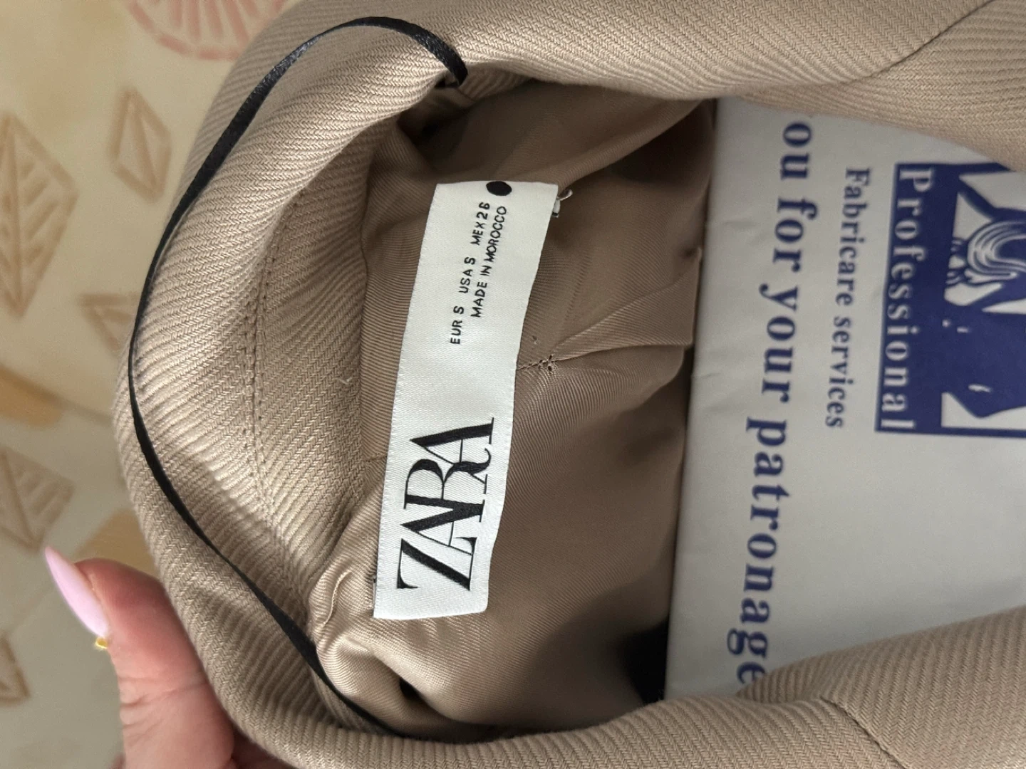 This ZARA coat is a stylish tan colour, made from a wool blend. It's a size S and features a flattering belted waist. This coat is perfect for a professional or casual look!