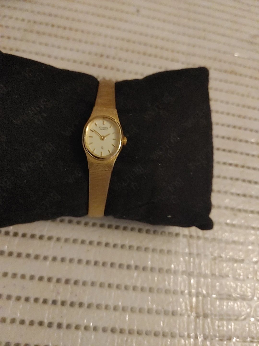 A classic gold tone women's watch from Citizen. Features a rectangular face and a metal band with a secure clasp. This elegant timepiece is perfect for everyday wear or special occasions.needs a battery