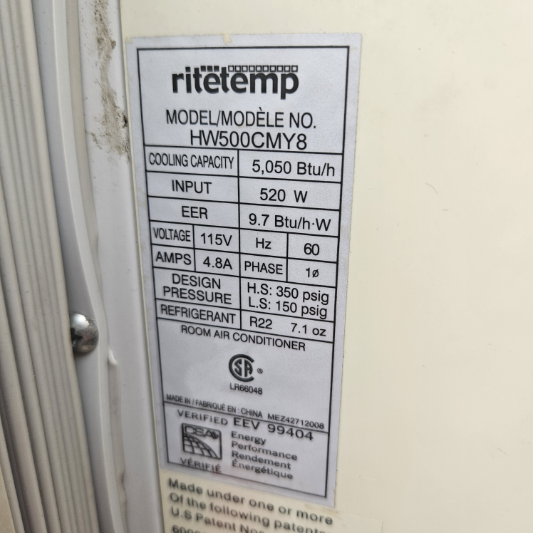 Selling a RiteTemp room air conditioner. The model number is HW500CMY8. It has a cooling capacity of 5,050 Btu/h. It's a standard room air conditioner that runs on 115V and 60Hz.
